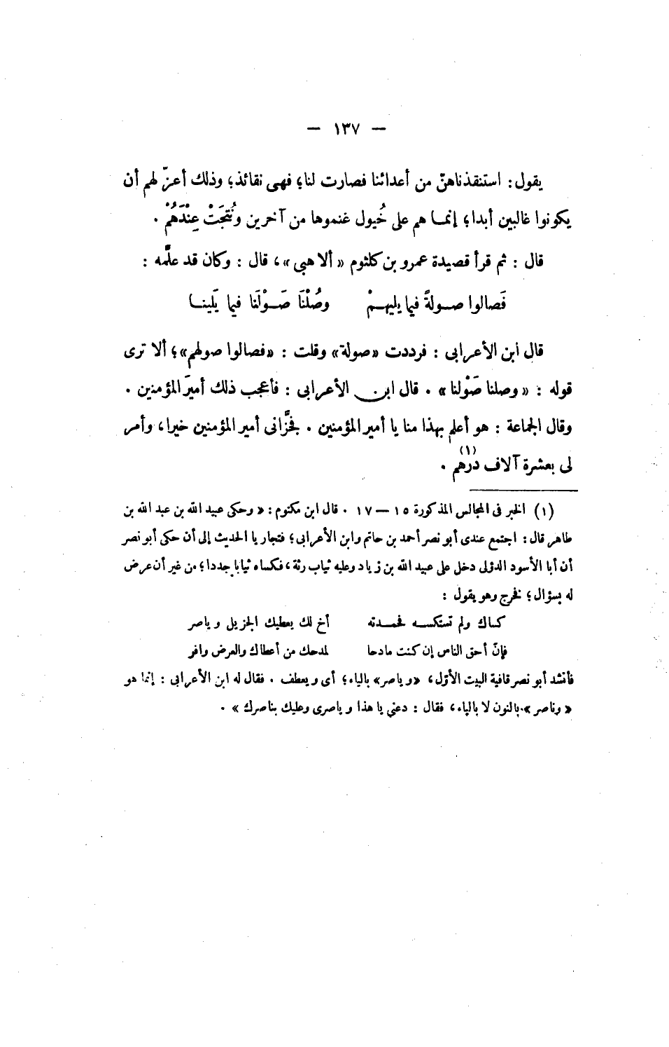 [1] الخبر فى المجالس المذكورة 15 - 17. قال ابن مكتوم: «وحكى عبيد الله بن عبد الله بن طاهر قال: اجتمع عندى أبو نصر أحمد بن حاتم وابن الأعرابى؛ فتجار يا الحديث إلى أن حكى أبو نصر أن أبا الأسود الدؤلى دخل على عبيد الله بن زياد وعليه ثياب رثة، فكساه ثيابا جددا؛ من غير أن عرض له بسؤال؛ فخرج وهو يقول: