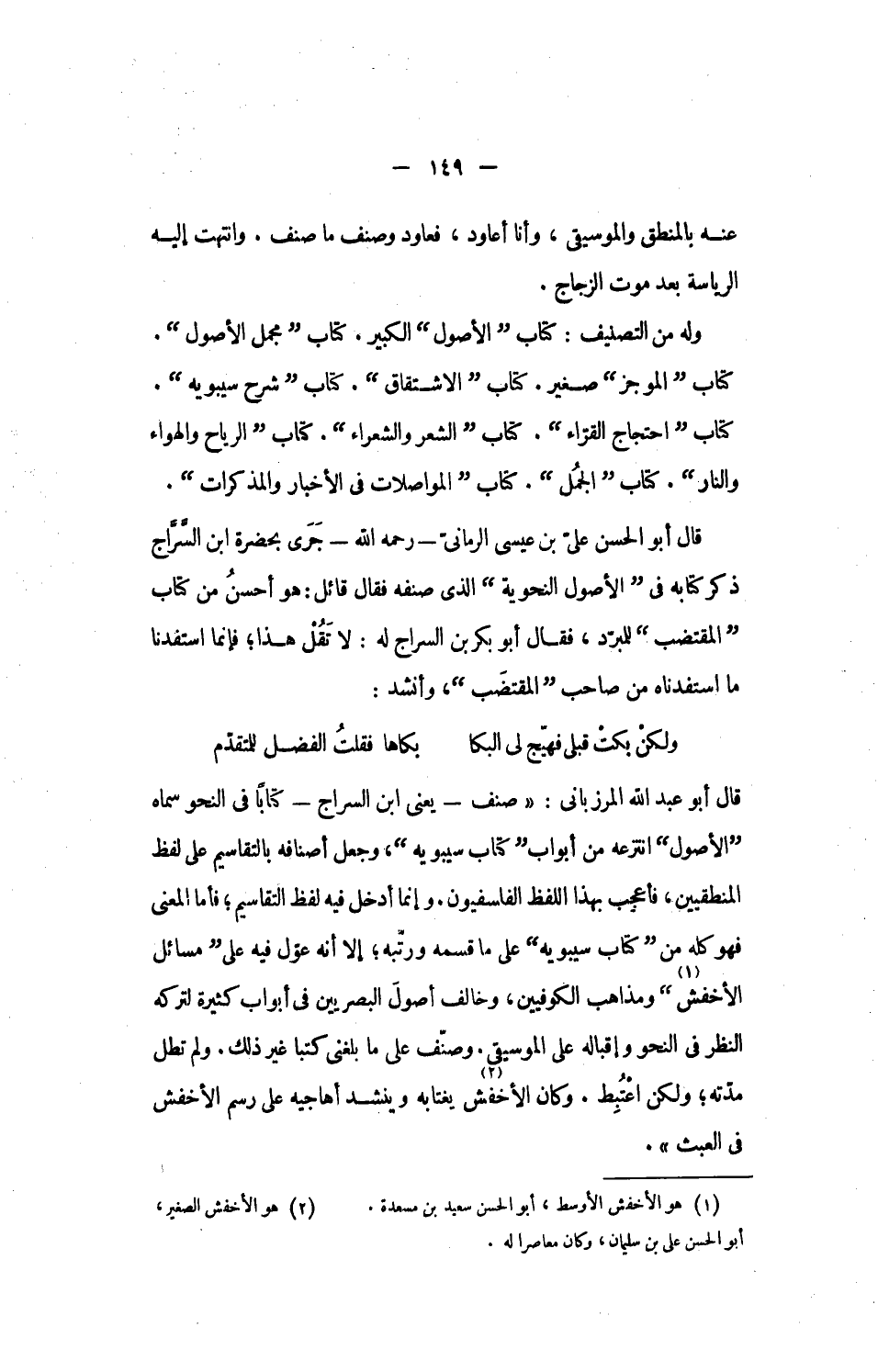 قال أبو عبد الله المرزبانى: «صنف- يعنى ابن السراج- كتابا فى النحو سماه الأصول انتزعه من أبواب كتاب سيبويه، وجعل أصنافه بالتقاسيم على لفظ المنطقيين، فأعجب بهذا اللفظ الفاسفيون. وإنما أدخل فيه لفظ التقاسيم؛ فأما المعنى فهو كله من كتاب سيبويه على ما قسمه ورتّبه؛ إلا أنه عوّل فيه على مسائل الأخفش [1] ومذاهب الكوفيين، وخالف أصول البصريين فى أبواب كثيرة لتركه النظر فى النحو وإقباله على الموسيقى. وصنّف على ما بلغنى كتبا غير ذلك. ولم تطل مدّته؛ ولكن اعتبط. وكان الأخفش [2] يغتابه وينشد أهاجيه على رسم الأخفش فى العبث».