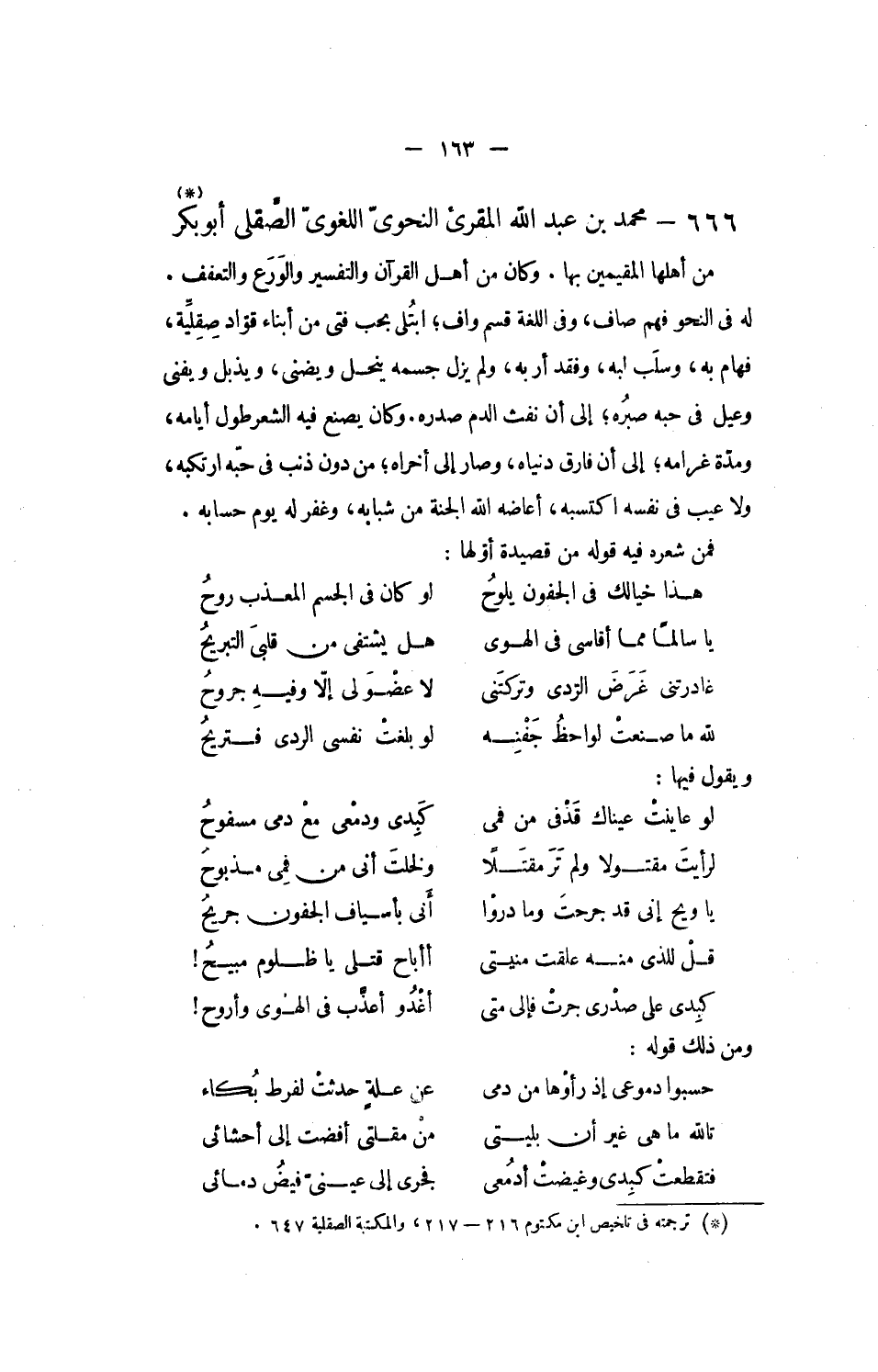 له فى النحو فهم صاف، وفى اللغة قسم واف؛ ابتلى بحب فتى من أبناء قوّاد صقليّة، فهام به، وسلب لبه، وفقد أربه، ولم يزل جسمه ينحل ويضنى، ويذبل ويفنى وعيل فى حبه صبره؛ إلى أن نفث الدم صدره. وكان يصنع فيه الشعر طول أيامه، ومدّة غرامه؛ إلى أن فارق دنياه، وصار إلى أخراه؛ من دون ذنب فى حبّه ارتكبه، ولا عيب فى نفسه اكتسبه، أعاضه الله الجنة من شبابه، وغفر له يوم حسابه.
