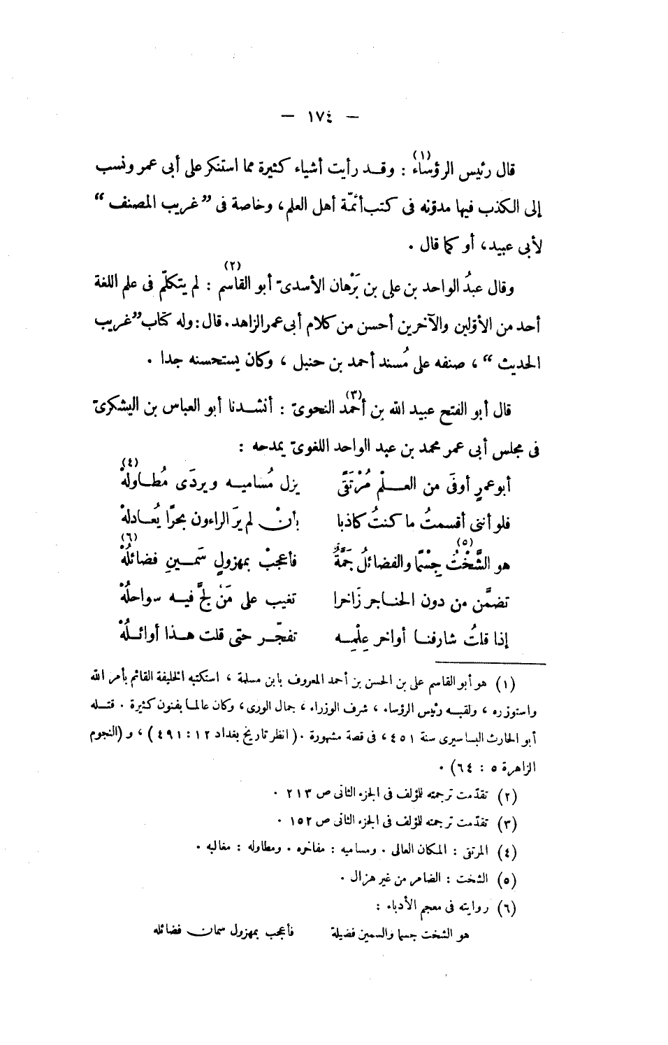 [1] هو أبو القاسم على بن الحسن بن أحمد المعروف بابن مسلمة، استكتبه الخليفة القائم بأمر الله واستوزره، ولقبه رئيس الرؤساء، شرف الوزراء، جمال الورى، وكان عالما بفنون كثيرة. قتله أبو الحارث البساسيرى سنة 451، فى قصة مشهورة. (انظر تاريخ بغداد 12: 491)، و (النجوم الزاهرة 5: 64).