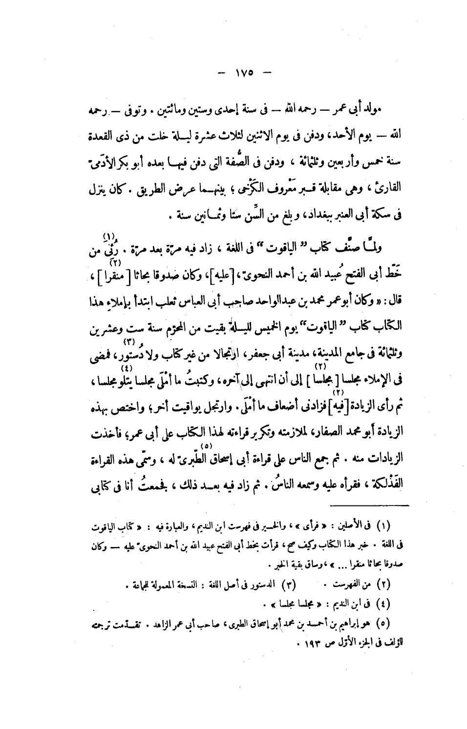ولمّا صنّف كتاب الياقوت فى اللغة، زاد فيه مرّة بعد مرّة. رئى [1] من خطّ أبى الفتح عبيد الله بن أحمد النحوىّ، [عليه]، وكان صدوقا بحاثا [منقرا [2]]، قال: «وكان أبو عمر محمد بن عبد الواحد صاحب أبى العباس ثعلب ابتدأ بإملاء هذا الكتاب كتاب الياقوت يوم الخميس لليلة بقيت من المحرّم سنة ست وعشرين وثلاثمائة فى جامع المدينة، مدينة أبى جعفر، ارتجالا من غير كتاب ولا دستور [3]، فمضى فى الإملاء مجلسا [مجلسا [2]] إلى أن انتهى إلى آخره، وكتبت ما أملى مجلسا يتلو [4] مجلسا، ثم رأى الزيادة [فيه [2]] فزادنى أضعاف ما أملى. وارتجل يواقيت أخر؛ واختص بهذه الزيادة أبو محمد الصفار، لملازمته وتكرير قراءته لهذا الكتاب على أبى عمر؛ فأخذت الزيادات منه. ثم جمع الناس على قراءة أبى إسحاق [5] الطّبرىّ له، وسمّى هذه القراءة الفذلكة، فقرأه عليه وسمعه الناس. ثم زاد فيه بعد ذلك، فجمعت أنا فى كتابى