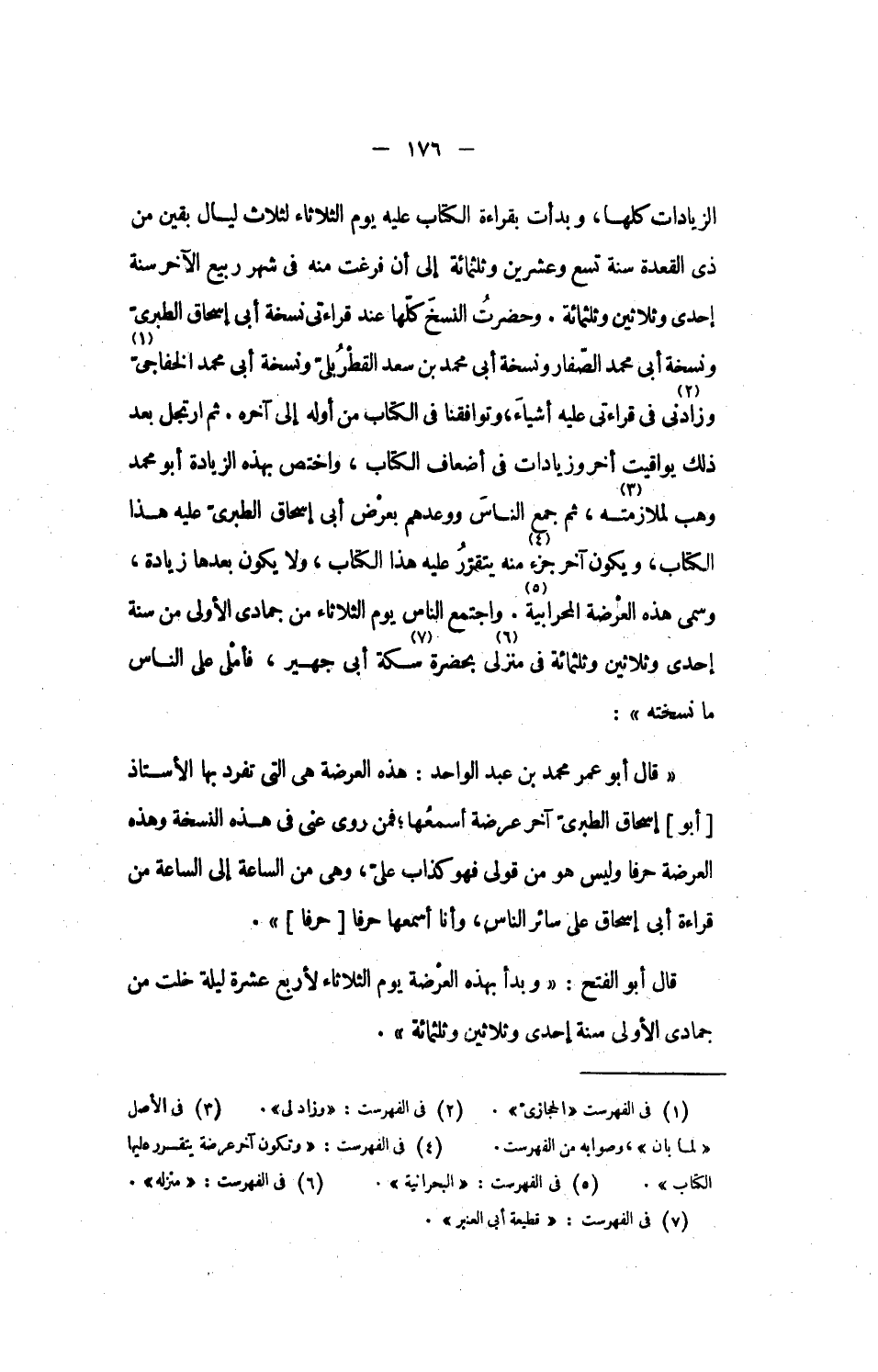 «قال أبو عمر محمد بن عبد الواحد: هذه العرضة هى التى تفرد بها الأستاذ [أبو] إسحاق الطبرىّ آخر عرضة أسمعها؛ فمن روى عنى فى هذه النسخة وهذه العرضة حرفا وليس هو من قولى فهو كذاب علىّ، وهى من الساعة إلى الساعة من قراءة أبى إسحاق على سائر الناس، وأنا أسمعها حرفا [حرفا]».