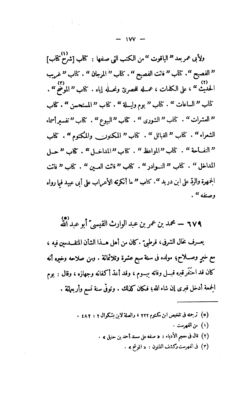 ولأبى عمر بعد الياقوت من الكتب التى صنفها: كتاب [شرح [1] كتاب] الفصيح. كتاب فائت الفصيح. كتاب المرجان. كتاب غريب الحديث [2]، على الكلمات، عمله للحصرىّ ونحله إياه. كتاب الموضح [3].