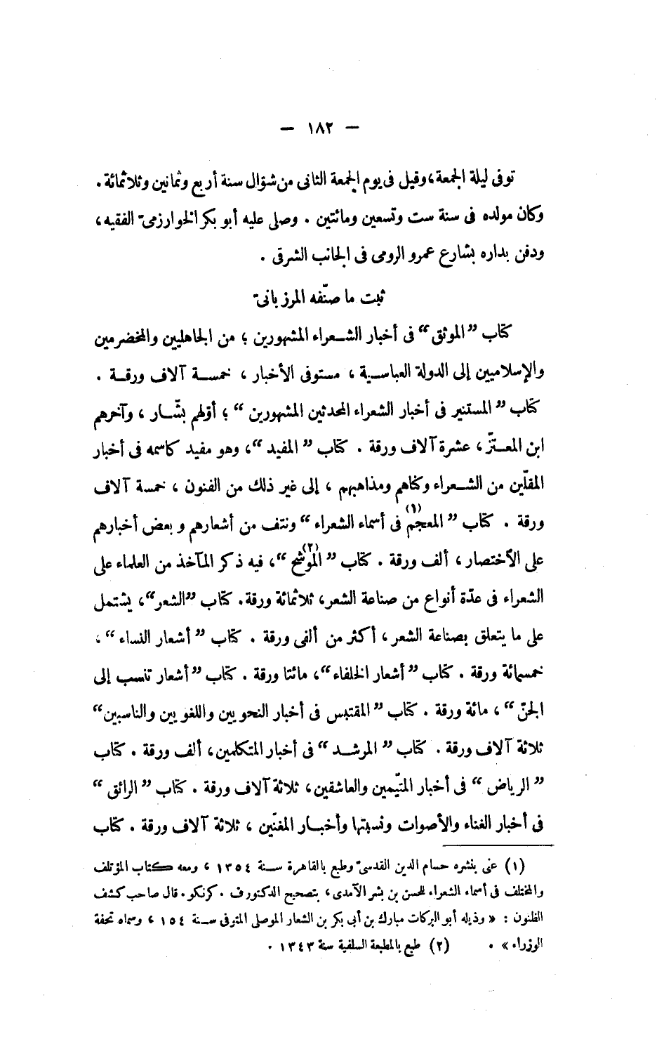 ثبت ما صنّفه المرزبانىّ كتاب الموثق فى أخبار الشعراء المشهورين؛ من الجاهليين والمخضرمين والإسلاميين إلى الدولة العباسية، مستوفى الأخبار، خمسة آلاف ورقة.