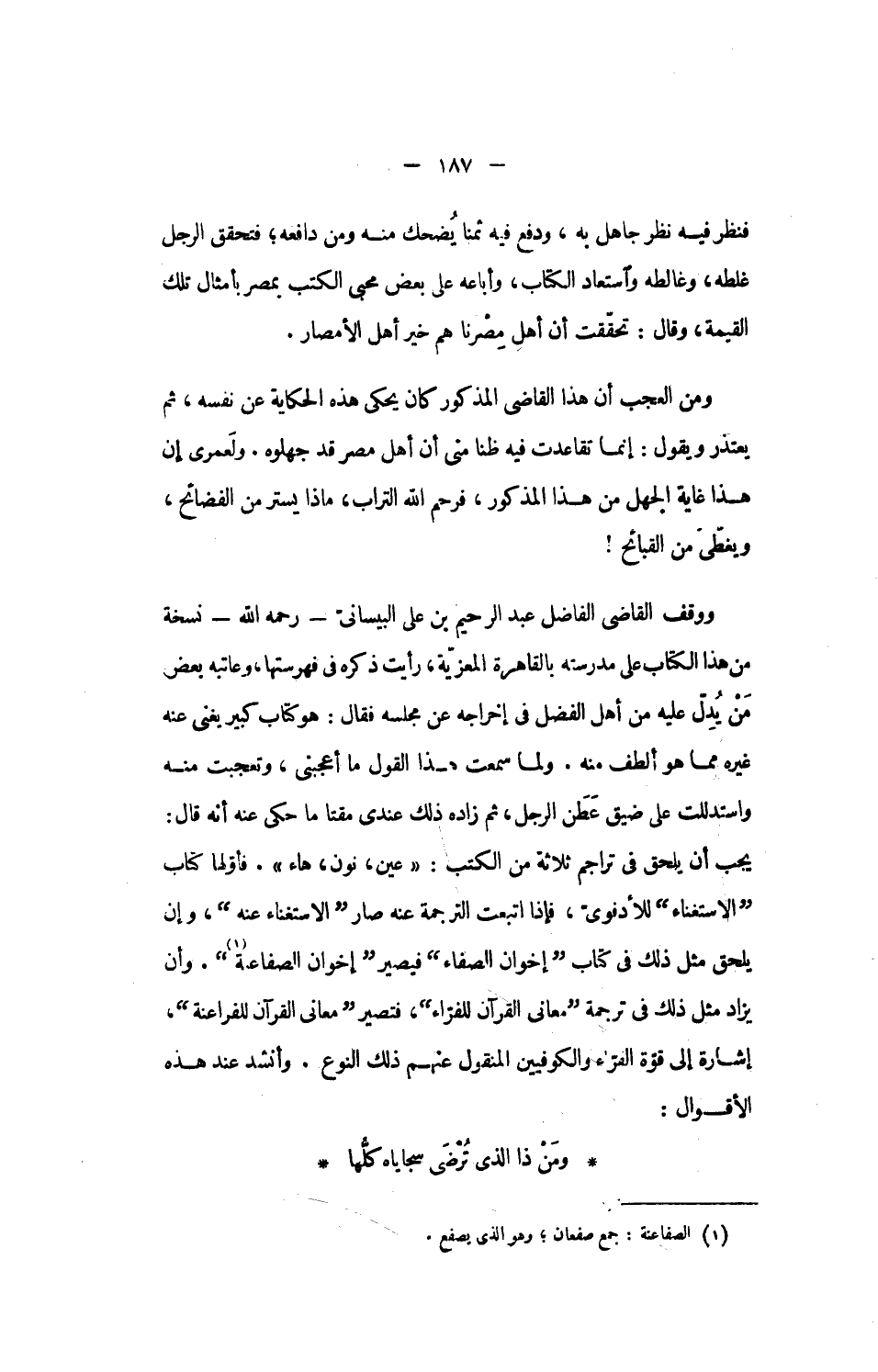 يجب أن يلحق فى تراجم ثلاثة من الكتب: «عين، نون، هاء». فأوّلها كتاب الاستغناء للأدفوىّ، فإذا اتبعت الترجمة عنه صار الاستغناء عنه، وإن يلحق مثل ذلك فى كتاب إخوان الصفاء فيصير إخوان الصفاعنة [1]. وأن يزاد مثل ذلك فى ترجمة معانى القرآن للفرّاء، فتصير معانى القرآن للفراعنة، إشارة إلى قوّة الفرّاء والكوفيين المنقول عنهم ذلك النوع. وأنشد عند هذه الأقوال: