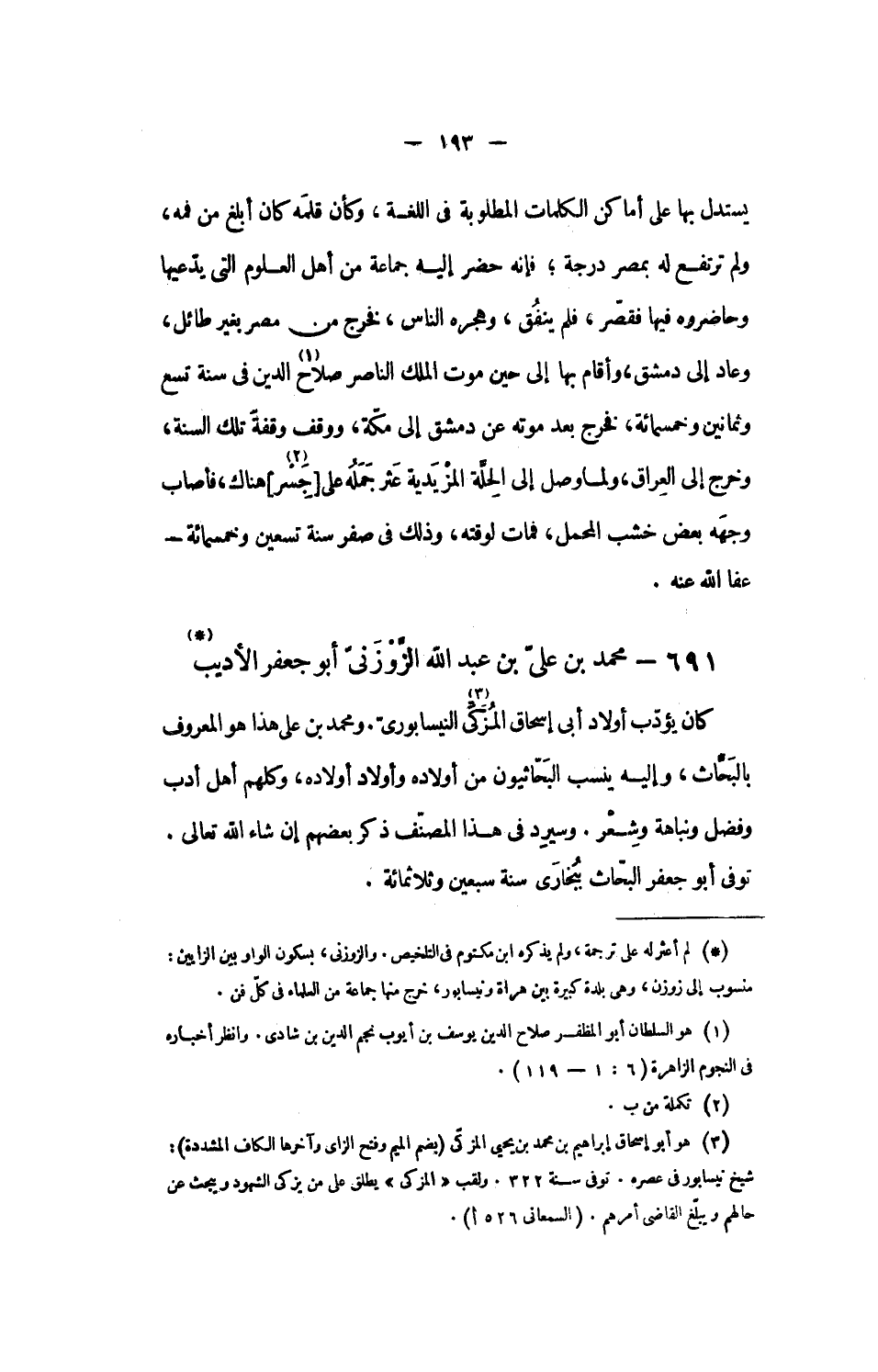 يستدل بها على أماكن الكلمات المطلوبة فى اللغة، وكأن قلمه كان أبلغ من فمه، ولم ترتفع له بمصر درجة؛ فإنه حضر إليه جماعة من أهل العلوم التى يدّعيها وحاضروه فيها فقصّر، فلم ينفق، وهجره الناس، فخرج من مصر بغير طائل، وعاد إلى دمشق، وأقام بها إلى حين موت الملك الناصر صلاح [1] الدين فى سنة تسع وثمانين وخمسمائة، فخرج بعد موته عن دمشق إلى مكّة، ووقف وقفة تلك السنة، وخرج إلى العراق، ولما وصل إلى الحلّة المزيدية عثر جمله على [جسر [2]] هناك، فأصاب وجهه بعض خشب المحمل، فمات لوقته، وذلك فى صفر سنة تسعين وخمسمائة- عفا الله عنه.