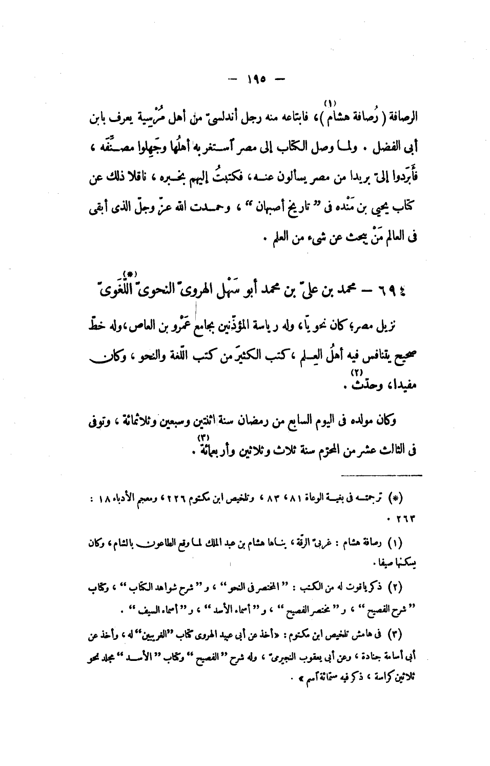 [3] فى هامش تلخيص ابن مكتوم: «أخذ عن أبى عبيد الهروى كتاب الغريبين له، وأخذ عن أبى أسامة جنادة، وعن أبى يعقوب النجيرمىّ، وله شرح الفصيح وكتاب الأسد مجلد نحو ثلاثين كراسة، ذكر فيه ستمائة اسم».