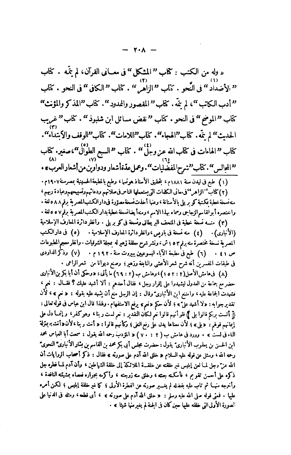 «وله من الكتب: كتاب المشكل فى معانى القرآن، لم يتمّه. كتاب الأضداد [1] فى النّحو. كتاب الزاهر [2]. كتاب الكافى فى النحو. كتاب أدب الكاتب، لم يتمّه. كتاب المقصور والممدود. كتاب المذكر والمؤنث كتاب الموضح فى النحو. كتاب نقض مسائل ابن شنبوذ. كتاب غريب الحديث لم يتمّه. كتاب الهجاء. كتاب اللامات. كتاب الوقف والابتداء [3].