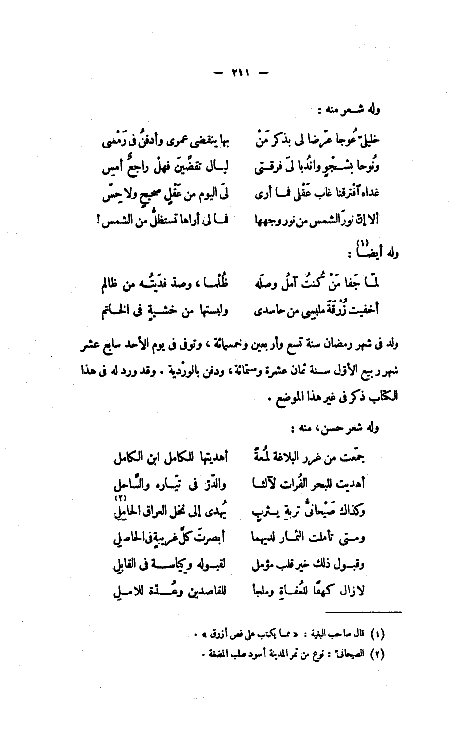 ولد فى شهر رمضان سنة تسع وأربعين وخمسمائة، وتوفى فى يوم الأحد سابع عشر شهر ربيع الأوّل سنة ثمان عشرة وستمائة، ودفن بالوردية. وقد ورد له فى هذا الكتاب ذكر فى غير هذا الموضع.
