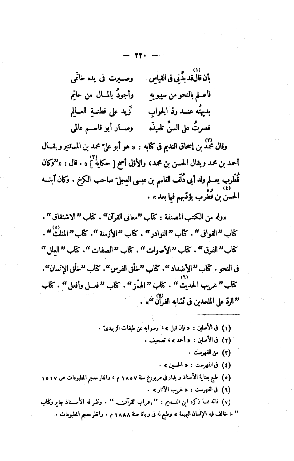 [7] فاته مما ذكره ابن النديم: إعراب القرآن. ونشر له الأستاذ جاير وكتاب ما خالف فيه الإنسان البهيمة» وطمع له فى ويانا سنة 1888 م. وانظر معجم المطبوعات.