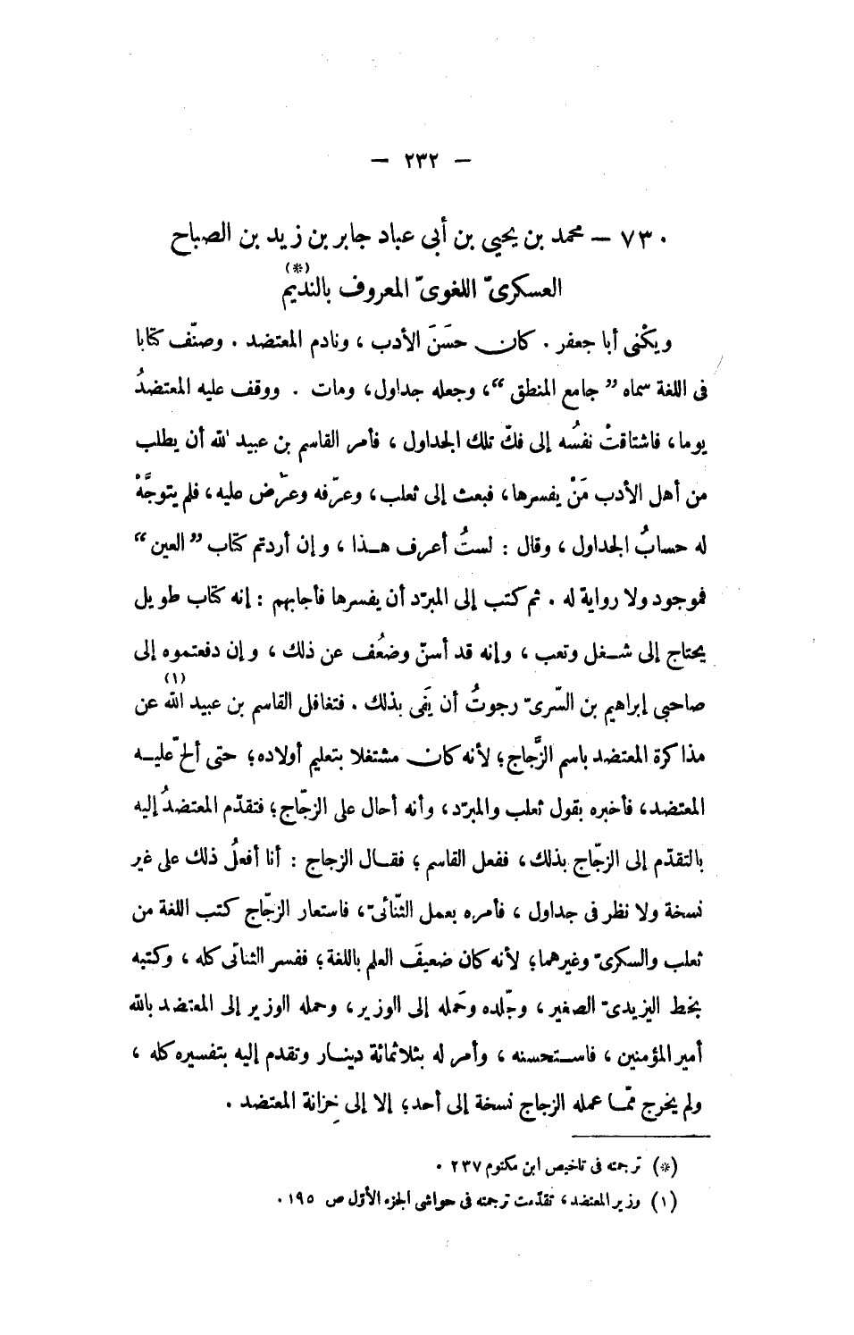 730 - محمد بن يحيى بن أبى عباد جابر بن زيد بن الصباح العسكرىّ اللغوىّ المعروف بالنديم «1»