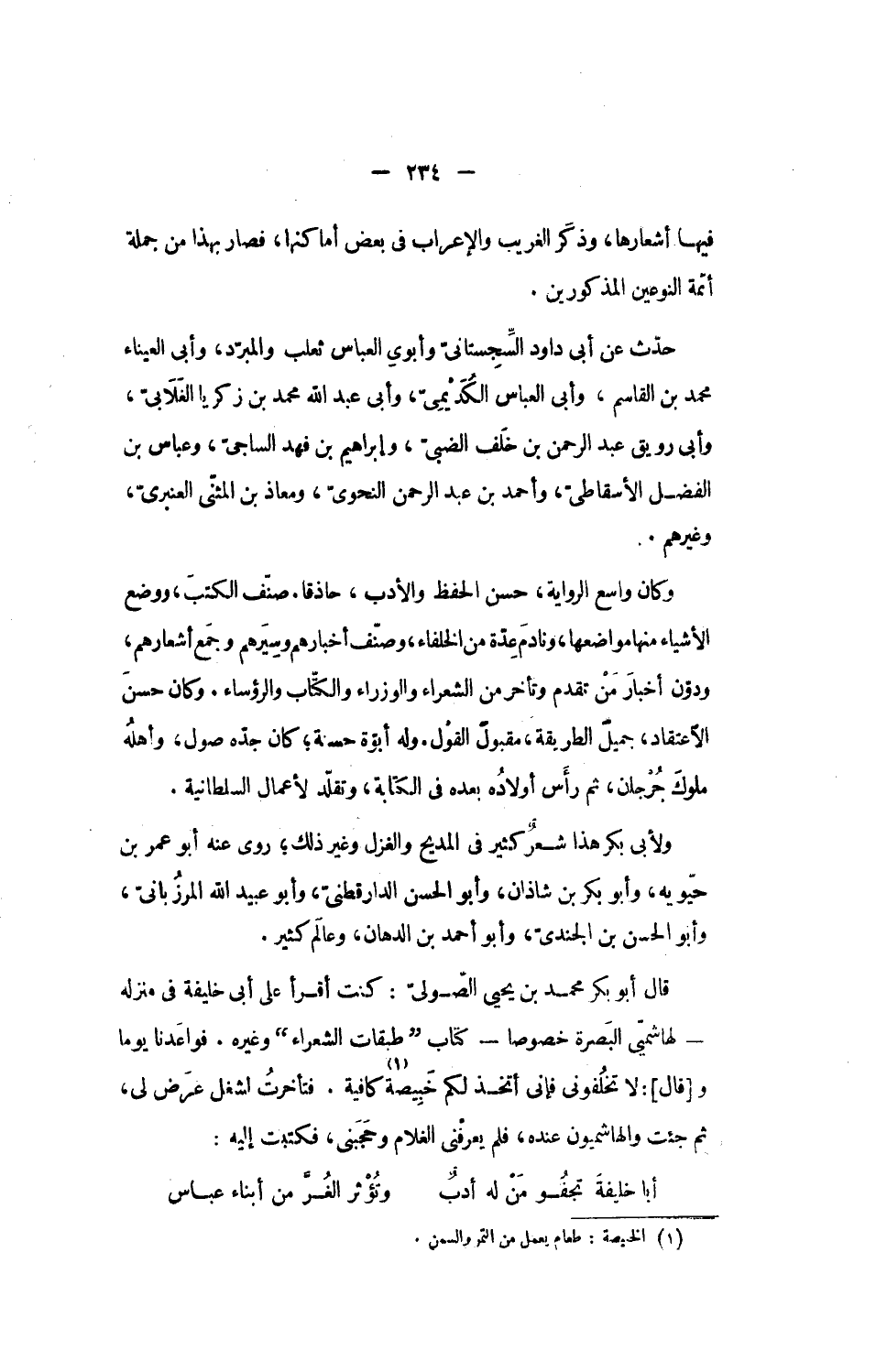 قال أبو بكر محمد بن يحيى الصّولىّ: كنت أقرأ على أبى خليفة فى منزله- لهاشمييّ البصرة خصوصا- كتاب طبقات الشعراء وغيره. فواعدنا يوما و [قال]: لا تخلفونى فإنى أتخذ لكم خبيصة [1] كافية. فتأخرت لشغل عرض لى، ثم جئت والهاشميون عنده، فلم يعرفنى الغلام وحجبنى، فكتبت إليه: