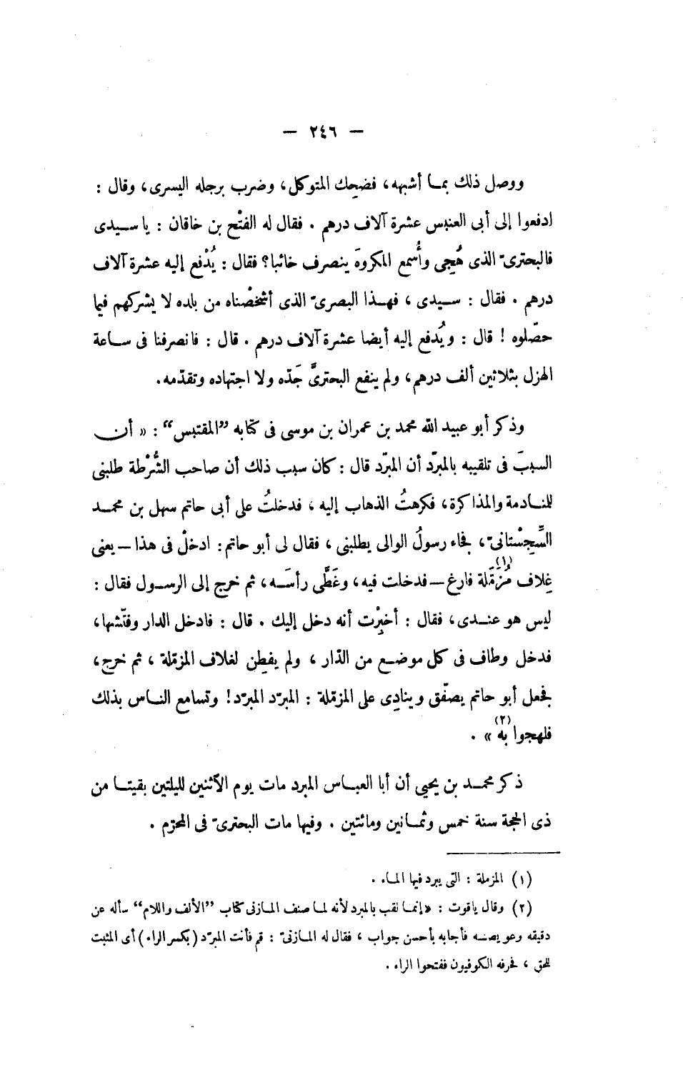 ليس هو عندى، فقال: أخبرت أنه دخل إليك. قال: فادخل الدار وفتّشها، فدخل وطاف فى كل موضع فى الدّار، ولم يفطن لغلاف المزمّلة، ثم خرج، فجعل أبو حاتم يصفّق وينادى على المزمّلة: المبرّد المبرّد! وتسامع الناس بذلك فلهجوا به [2]».