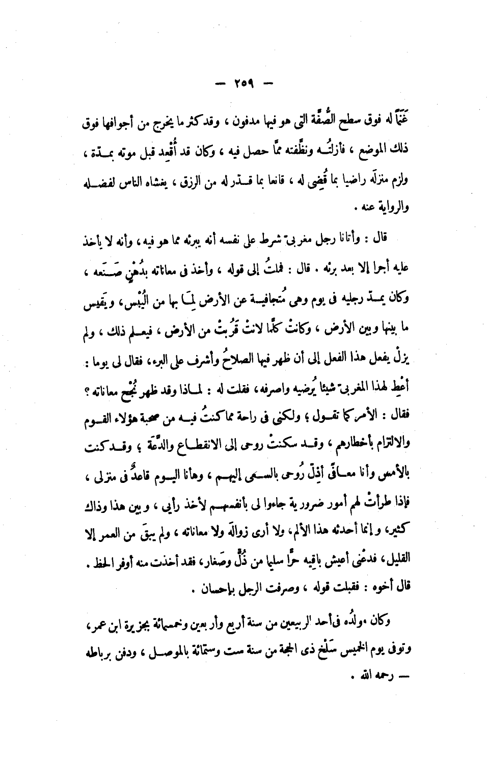 غنما له فوق سطح الصّفّة التى هو فيها مدفون، وقد كثر ما يخرج من أجوافها فوق ذلك الموضع، فأزلته ونظّفته ممّا حصل فيه، وكان قد أقعد قبل موته بمدّة، ولزم منزله راضيا بما قضى له، قانعا بما قدّر له من الرزق، يغشاه الناس لفضله والرواية عنه.