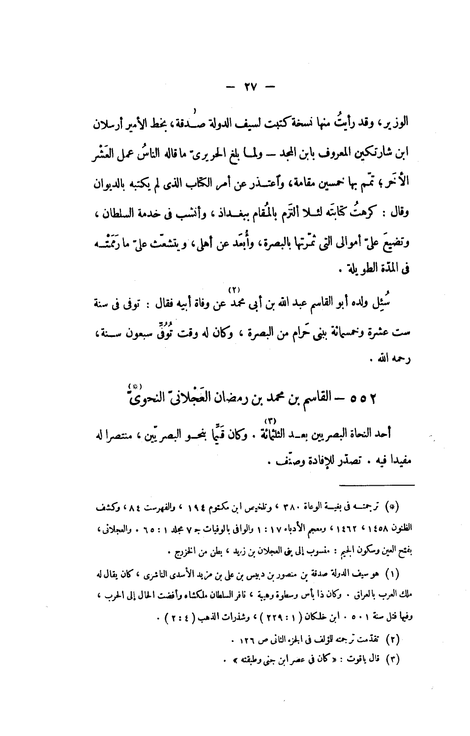 الوزير، وقد رأيت منها نسخة كتبت لسيف الدولة صدقة، بخط الأمير أرسلان ابن شارتكين المعروف بابن المجد- ولما بلغ الحريرىّ ما قاله الناس عمل العشر الأخر؛ تمّم بها خمسين مقامة، واعتذر عن أمر الكتاب الذى لم يكتبه بالديوان وقال: كرهت كتابته لئلا ألتزم بالمقام ببغداذ، وأنشب فى خدمة السلطان، وتضيع علىّ أموالى التى ثمّرتها بالبصرة، وأبعد عن أهلى، ويتشعّث علىّ وما رممته فى المدّة الطويلة.