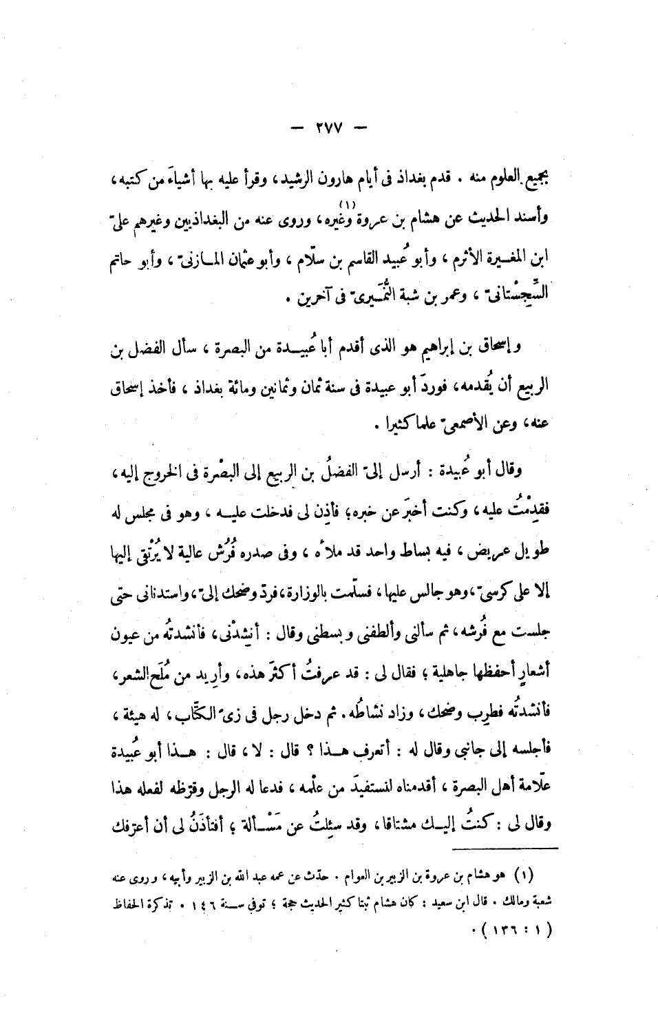 بجميع العلوم منه. قدم بغداذ فى أيام هارون الرشيد، وقرأ عليه بها أشياء من كتبه، وأسند الحديث عن هشام بن عروة [1] وغيره، وروى عنه من البغداذيين وغيرهم علىّ ابن المغيرة الأثرم، وأبو عبيد القاسم بن سلّام، وأبو عثمان المازنىّ، وأبو حاتم السّجستانىّ، وعمر بن شبة النّميرىّ فى آخرين.