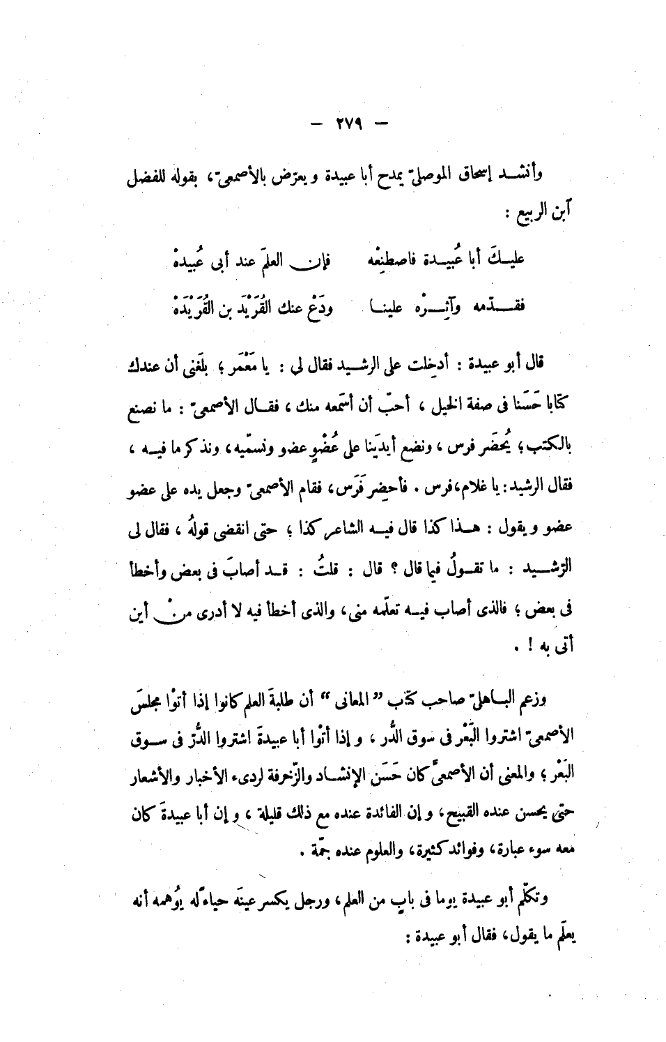 وأنشد إسحاق الموصلىّ يمدح أبا عبيدة ويعرّض بالأصمعىّ، بقوله للفضل ابن الربيع: