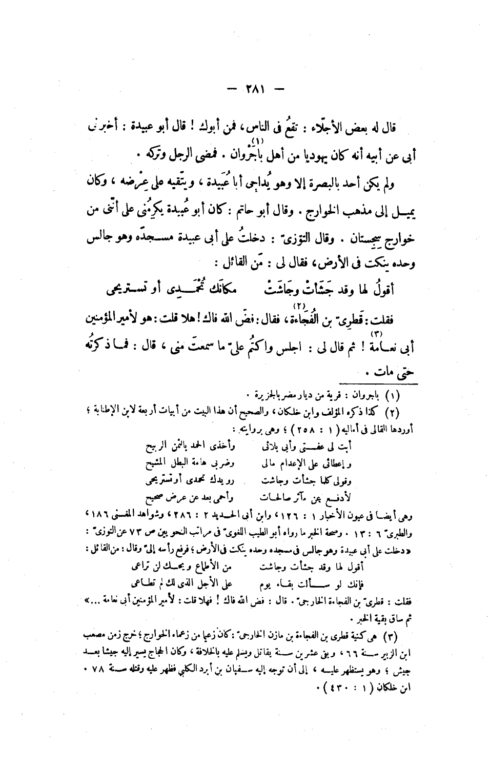 [3] هى كنية قطرى بن الفجاءة بن مازن الخارجىّ: كان زعيما من زعماء الخوارج؛ خرج زمن مصعب ابن الزبير سنة 66، وبقى عشرين سنة يقاتل ويسلم عليه بالخلافة، وكان الحجاج يسير إليه جيشا بعد جيش؛ وهو يستظهر عليه، إلى أن توجه إليه سفيان بن أبرد الكلبى فظهر عليه وقتله سنة 78.