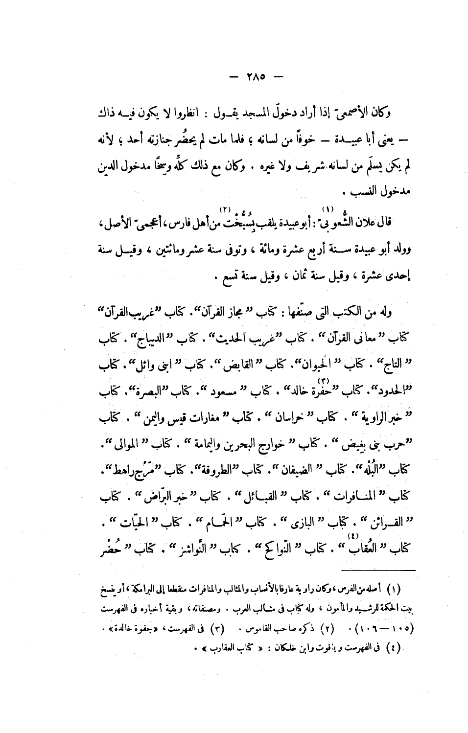 قال علان الشّعوبىّ [1]: أبو عبيدة يلقب بسبّخت [2] من أهل فارس، أعجمىّ الأصل، وولد أبو عبيدة سنة أربع عشرة ومائة، وتوفى سنة عشر ومائتين، وقيل سنة إحدى عشرة، وقيل سنة ثمان، وقيل سنة تسع.