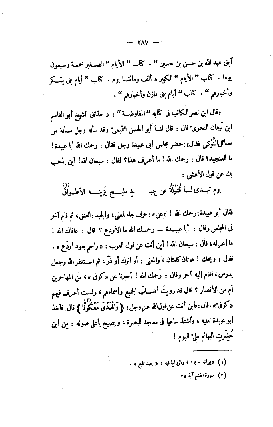 فقال أبو عبيدة: رحمك الله! «عن»: حرف جاء لمعنى، والجيد: العنق، ثم قام آخر فى المجلس وقال: أبا عبيدة- رحمك الله ما الأودع؟ قال: عافاك الله! ما أعرفه، قال: سبحان الله! أين أنت عن قول العرب: «زاحم بعود أودع».