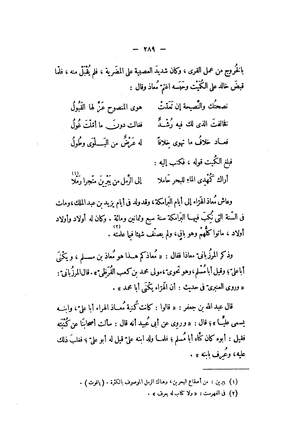 وذكر المرزبانىّ معاذا فقال: «معاذكم هذا هو معاذ بن مسلم، ويكنى أبا علىّ؛ وقيل أبا مسلم، وهو نحوىّ، مولى محمد بن كعب القرظىّ». قال المرزبانىّ: