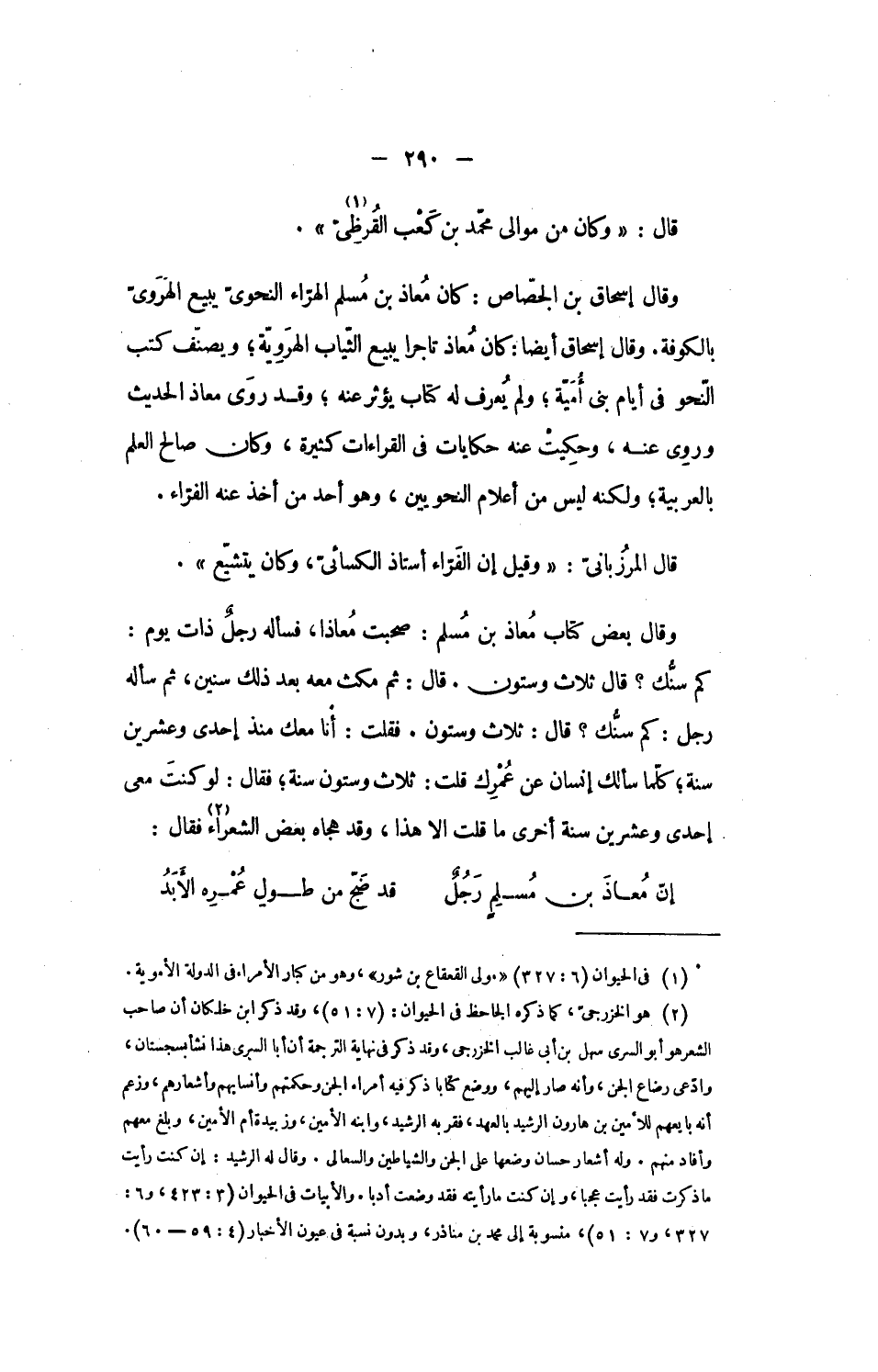 وقال إسحاق بن الجصّاص: كان معاذ بن مسلم الهرّاء النحوىّ يبيع الهروىّ بالكوفة. وقال إسحاق أيضا: كان معاذ تاجرا يبيع الثّياب الهرويّة؛ ويصنّف كتب النّحو فى أيام بنى أميّة؛ ولم يعرف له كتاب يؤثر عنه؛ وقد روى معاذ الحديث وروى عنه، وحكيت عنه حكايات فى القراءات كثيرة، وكان صالح العلم بالعربية؛ ولكنه ليس من أعلام النحويين، وهو أحد من أخذ عنه الفرّاء.