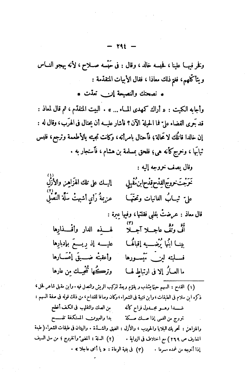 وفخر فيها علينا، فحبسه خالد، وقال: فى حبسه صلاح، لأنه يهجو الناس ويتأكّلهم، فغمّ ذلك معاذا، فقال الأبيات المتقدّمة: