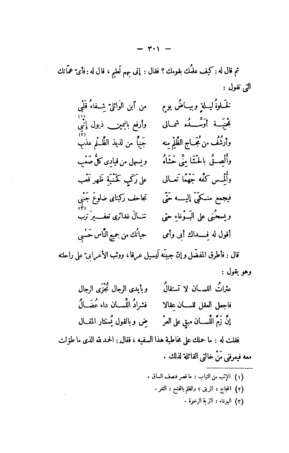 قال: فأطرق المفضّل وإنّ جبينه ليسيل عرقا، ووثب الأعرابىّ على راحلته وهو يقول: