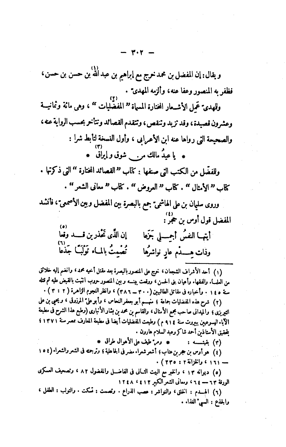 [2] شرح هذه المفضليات جماعة؛ منهم أبو جعفر النحاس، وأبو علىّ المرزوقى، ويحيى بن على التبريزى؛ والميدانى صاحب مجمع الأمثال، والقاسم بن محمد بن بشار الأنبارى (وطبع هذا الشرح فى مطبعة الآباء اليسوعيين ببيروت سنة 914 م) وطبعت المفضليات أيضا فى مطبعة المعارف بمصر سنة 1371؛ بتحقيق الأستاذين أحمد شاكر وعبد السلام هارون.