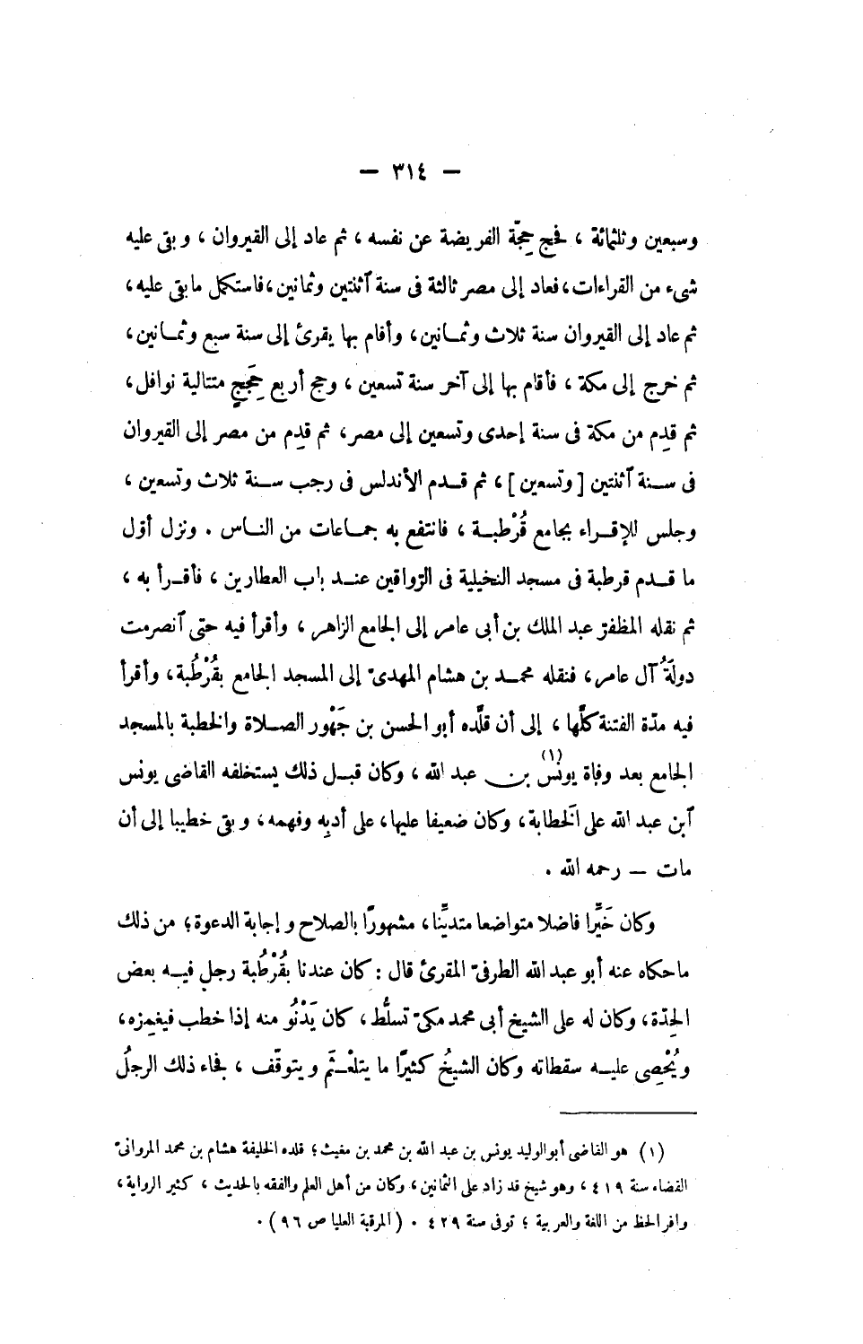 [1] هو القاضى أبو الوليد يونس بن عبد الله بن محمد بن مغيث؛ قلده الخليفة هشام بن محمد المروانىّ القضاء سنة 419، وهو شيخ قد زاد على الثمانين، وكان من أهل العلم والفقه بالحديث، كثير الرواية، وافر الحظ من اللغة والعربية؛ توفى سنة 429. (المرقبة العليا ص 96).