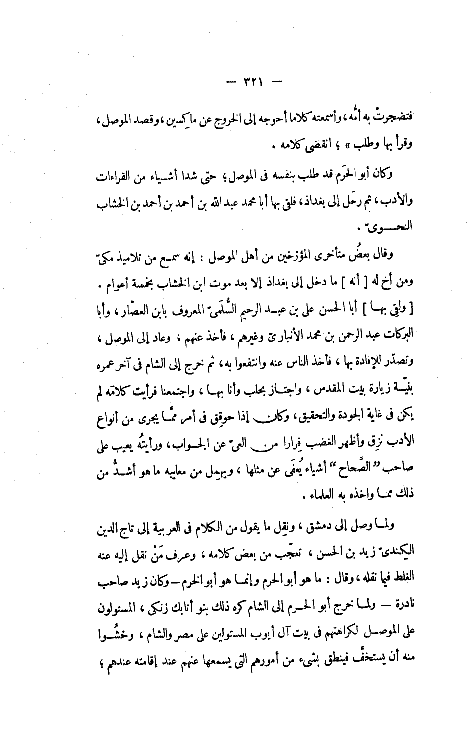 [ولقى بها] أبا الحسن على بن عبد الرحيم السّلمىّ المعروف بابن العصّار، وأبا البركات عبد الرحمن بن محمد الأنبارىّ وغيرهم، فأخذ عنهم، وعاد إلى الموصل، وتصدّر للإفادة بها، فأخذ الناس عنه وانتفعوا به، ثم خرج إلى الشام فى آخر عمره بنيّة زيارة بيت المقدس، واجتاز بحلب وأنا بها، واجتمعنا فرأيت كلامه لم يكن فى غاية الجودة والتحقيق، وكان إذا حوقق فى أمر ممّا يجرى من أنواع الأدب نزق وأظهر الغضب فرارا من العىّ عن الجواب، ورأيته يعيب على صاحب الصّحاح أشياء يعفى عن مثلها، ويهمل من معايبه ما هو أشدّ من ذلك مما واخذه به العلماء.