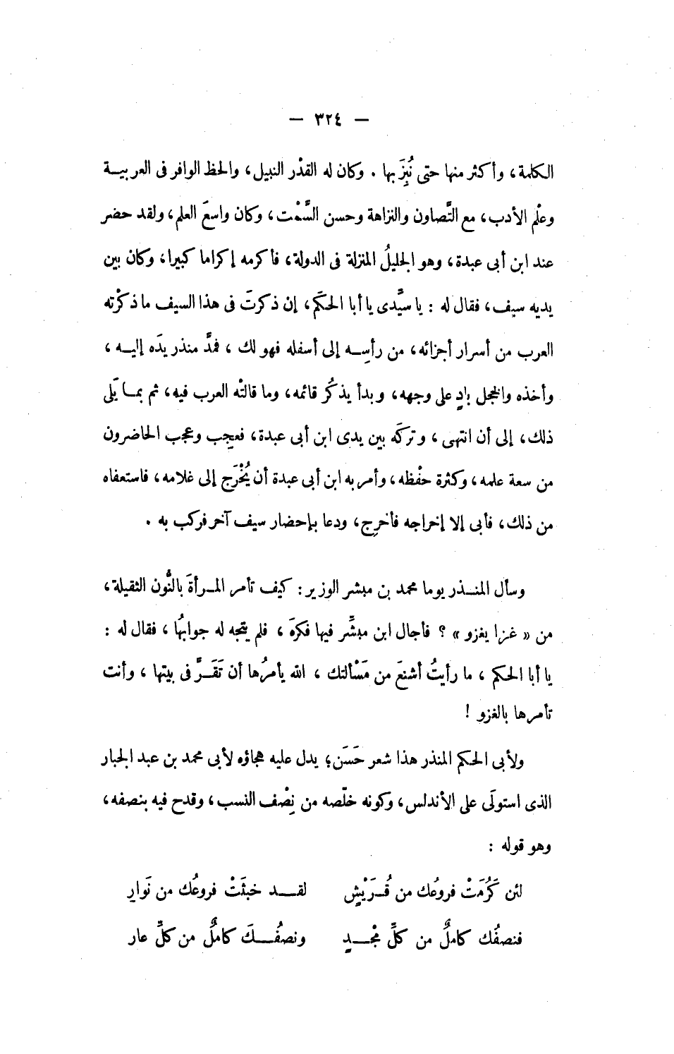 يا أبا الحكم، ما رأيت أشنع من مسألتك، الله يأمرها أن تقرّ فى بيتها، وأنت تأمرها بالغزو! ولأبى الحكم المنذر هذا شعر حسن؛ يدل عليه هجاؤه لأبى محمد بن عبد الجبار الذى استولى على الأندلس، وكونه خلّصه من نصف النسب، وقدح فيه بنصفه، وهو قوله: