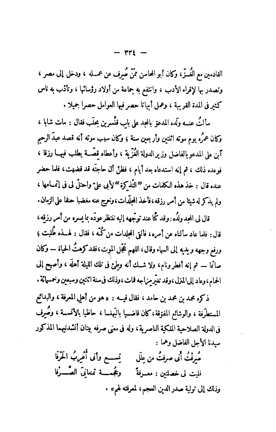 القادمين مع الغزّ، وكان أبو المحاسن ممّن صرف عن عمله، ودخل إلى مصر، وتصدر بها لإقراء الأدب، وانتفع به جماعة من أولاد رؤسائها، وتأدّب به ناس كثير فى المدة القريبة، وعمل أبياتا حصر فيها العوامل حصرا جميلا.