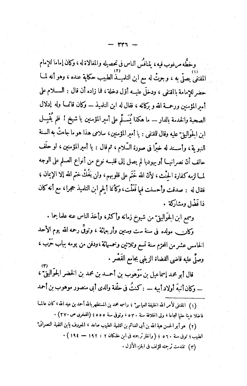 وخطّه مرغوب فيه، يتنافس الناس فى تحصيله والمغالاة له، وكان إماما للإمام المقتفى [1] يصلّى به، وجرت له مع ابن التلميذ [2] الطبيب حكاية عنده، وهو أنه لما حضر للإمامة بالمقتفى، ودخل عليه أوّل دخلة، فما زاده أن قال: السلام على أمير المؤمنين ورحمة الله وبركاته، فقال له ابن التلميذ- وكان قائما وله إدلال الصحبة والخدمة بالدار- ما هكذا يسلّم على أمير المؤمنين يا شيخ! فلم يقبل ابن الجواليقىّ عليه وقال للمقتفى: يا أمير المؤمنين، سلامى هذا هو ما جاءت به السنة النبوية، وأسند له خبرا فى صورة السّلام، ثم قال: يا أمير المؤمنين، لو حلف حالف أنّ نصرانيا أو يهوديا لم يصل إلى قلبه نوع من أنواع العلم على الوجه لما لزمه كفارة الحنث، لأنّ الله ختم على قلوبهم، ولن يفكّ ختم الله إلا الإيمان؛ فقال له: صدقت وأحسنت فيما فعلت، وكأنما ألجم ابن التلميذ حجرا، مع أنه كان ذا فضل ومشاركة.