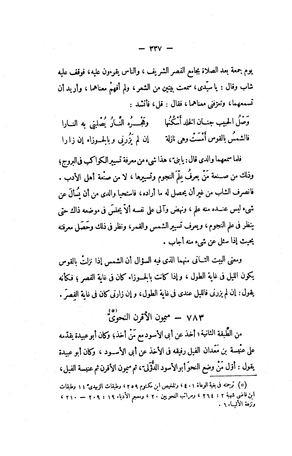 فانصرف الشاب من غير أن يحصل له ما أراده، فاستحيا والدى من أن يسأل عن شىء ليس عنده منه علم، ونهض وآلى على نفسه ألّا يجلس فى موضعه ذاك حتى ينظر فى علم النجوم، ويعرف تسيير الشمس والقمر، ونظر فى ذلك وحصل معرفته بحيث إذا سئل عن شىء منه أجاب.