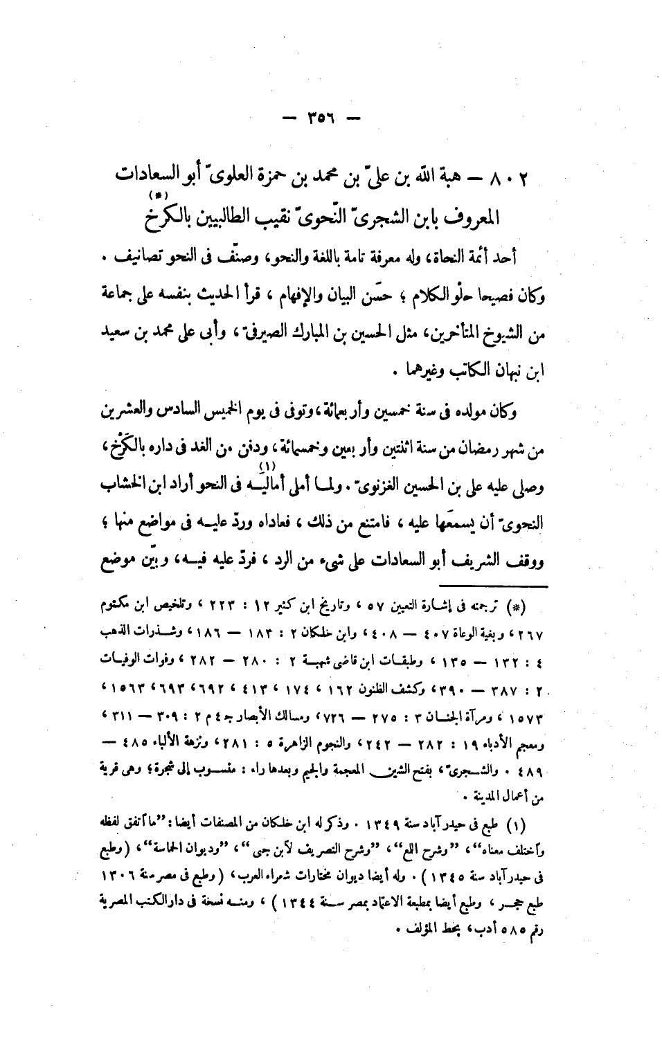802 - هبة الله بن علىّ بن محمد بن حمزة العلوىّ أبو السعادات المعروف بابن الشجرىّ النّحوىّ نقيب الطالبيين بالكرخ «1»
