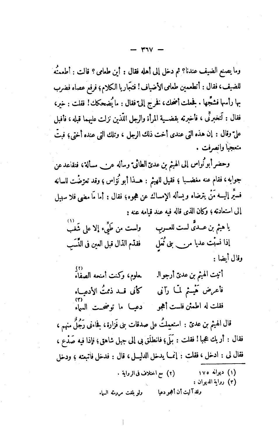 وحضر أبو نواس إلى الهيثم بن عدىّ الطائىّ وسأله عن مسألة، فتقاعد عن جوابه، فقام عنه مغضبا؛ فقيل للهيثم: هذا أبو نوّاس؛ وقد تعرّضت للسانه فسيّر إليه من يترضاه ويسأله الإمساك عن هجوه؛ فقال: أما ما مضى فلا سبيل إلى استعادته؛ وكان الذى قاله فيه عند قيامه عنه: