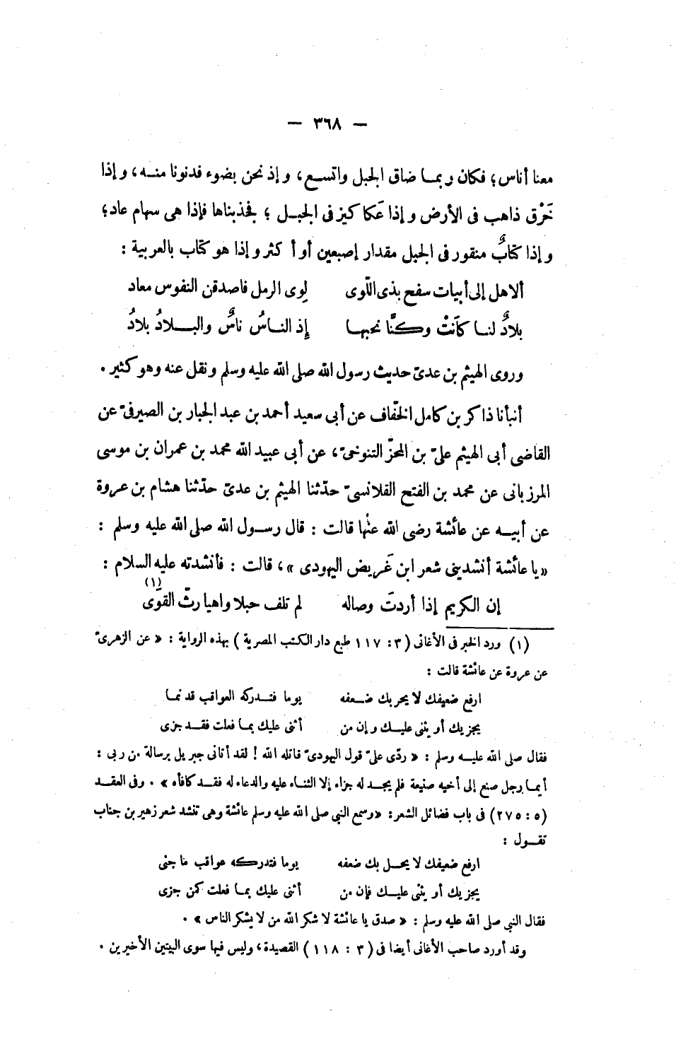[1] ورد الخبر فى الأغانى (3: 117 طبع دار الكتب المصرية) بهذه الرواية: «عن الزهرىّ عن عروة عن عائشة قالت: