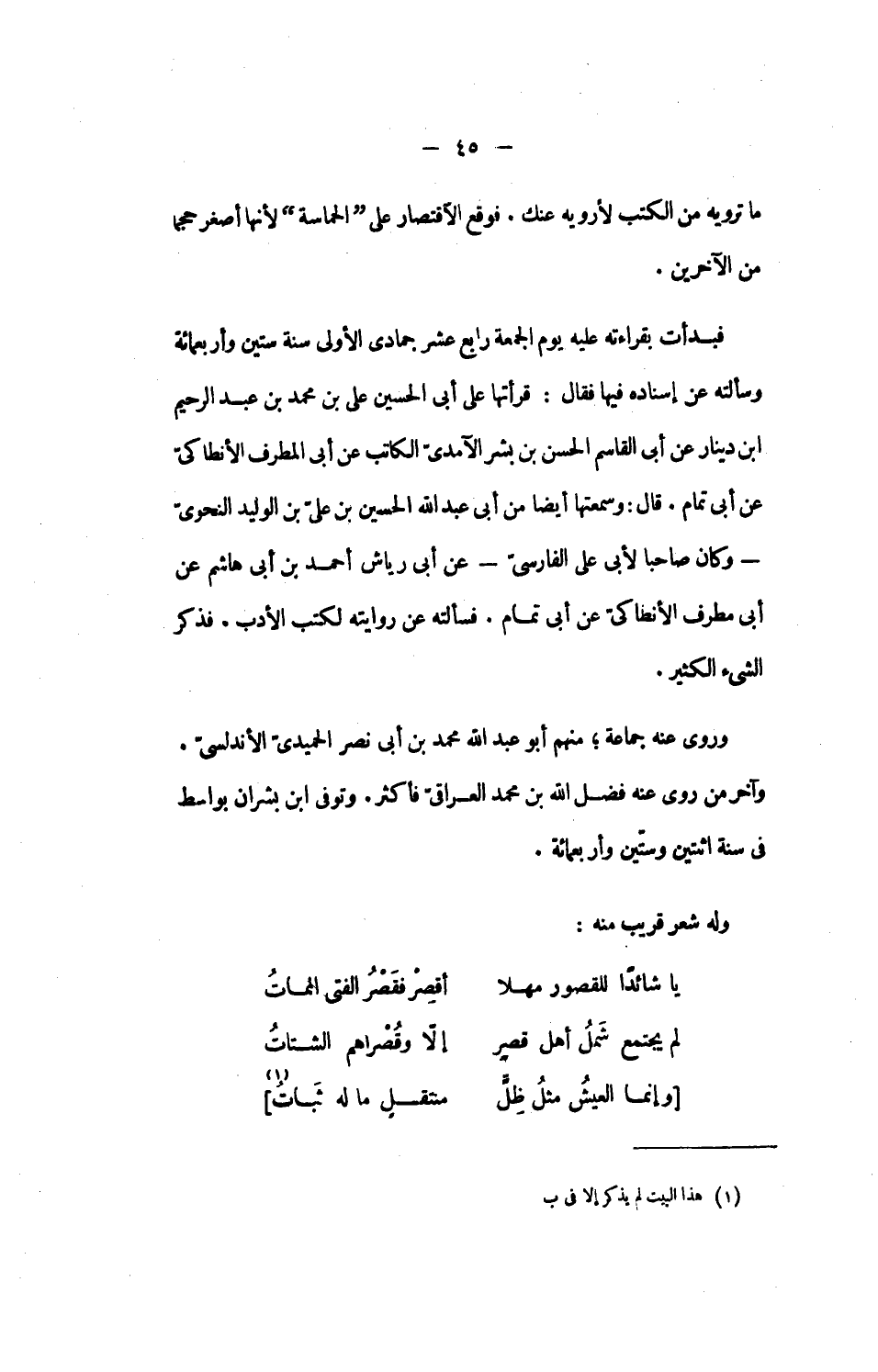 فبدأت بقراءته عليه يوم الجمعة رابع عشر جمادى الأولى سنة ستين وأربعمائة وسألته عن إسناده فيها فقال: قرأتها على أبى الحسين على بن محمد بن عبد الرحيم ابن دينار عن أبى القاسم الحسن بن بشر الآمدىّ الكاتب عن أبى المطرف الأنطاكىّ عن أبى تمام. قال: وسمعتها أيضا من أبى عبد الله الحسين بن علىّ بن الوليد النحوىّ- وكان صاحبا لأبى على الفارسىّ- عن أبى رياش أحمد بن أبى هاشم عن أبى مطرف الأنطاكىّ عن أبى تمام. فسألته عن روايته لكتب الأدب، فذكر الشىء الكثير.
