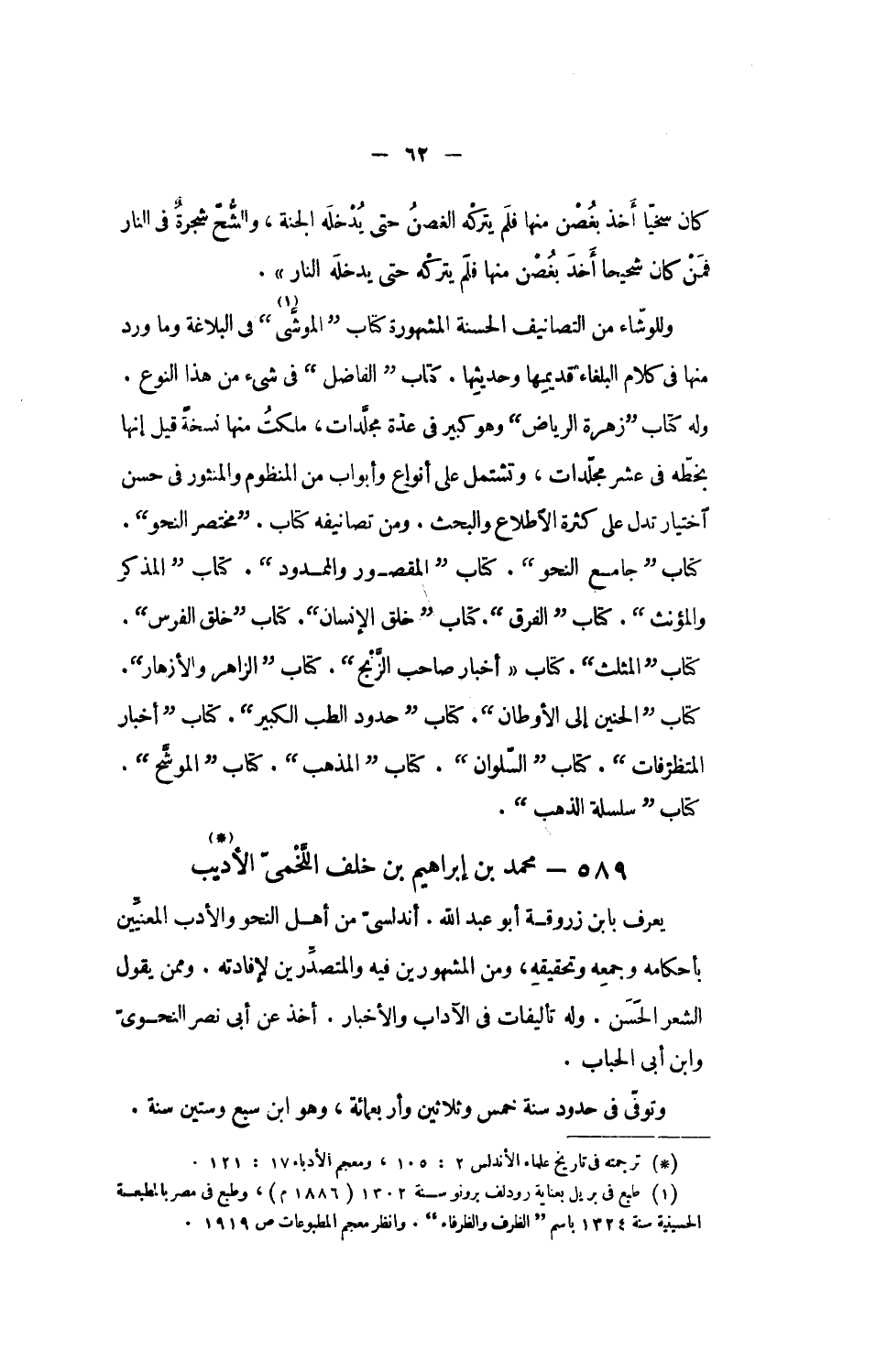 وللوشّاء من التصانيف الحسنة المشهورة كتاب الموشّى [1] فى البلاغة وما ورد منها فى كلام البلغاء قديمها وحديثها. كتاب الفاضل فى شىء من هذا النوع.