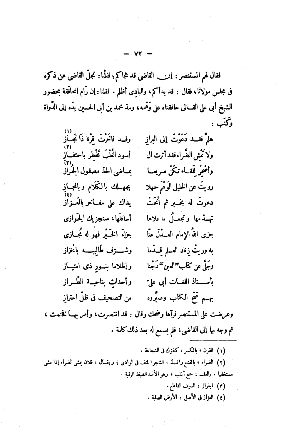 فقال لهم المستنصر: إن القاضى قد هجاكم؛ فقلنا: نجلّ القاضى عن ذكره فى مجلس مولانا، فقال: قد بدأكم، والبادى أظلم. فقلنا: إن رام المحافقة بحضور الشيخ أبى على القالى حافقناه على وهمه، ومدّ محمد بن أبى الحسين يده إلى الدّواة وكتب: