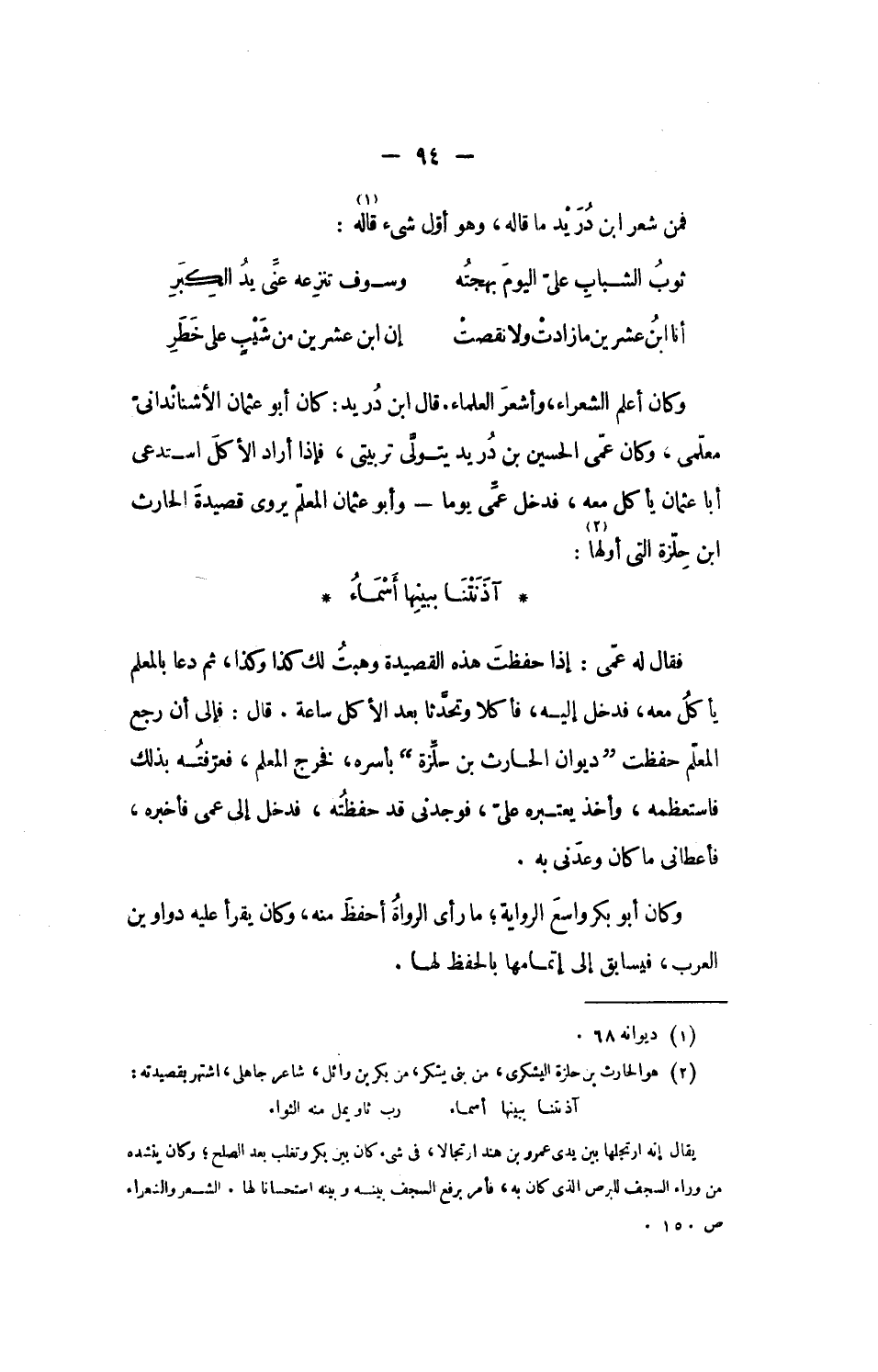 فقال له عمّى: إذا حفظت هذه القصيدة وهبت لك كذا وكذا، ثم دعا بالمعلم يأكل معه، فدخل إليه، فأكلا وتحدّثا بعد الأكل ساعة. قال: فإلى أن رجع المعلّم حفظت ديوان الحارث بن حلّزة بأسره، فخرج المعلم، فعرّفته بذلك فاستعظمه، وأخذ يعتبره علىّ، فوجدنى قد حفظته، فدخل إلى عمى فأخبره، فأعطانى ما كان وعدنى به.