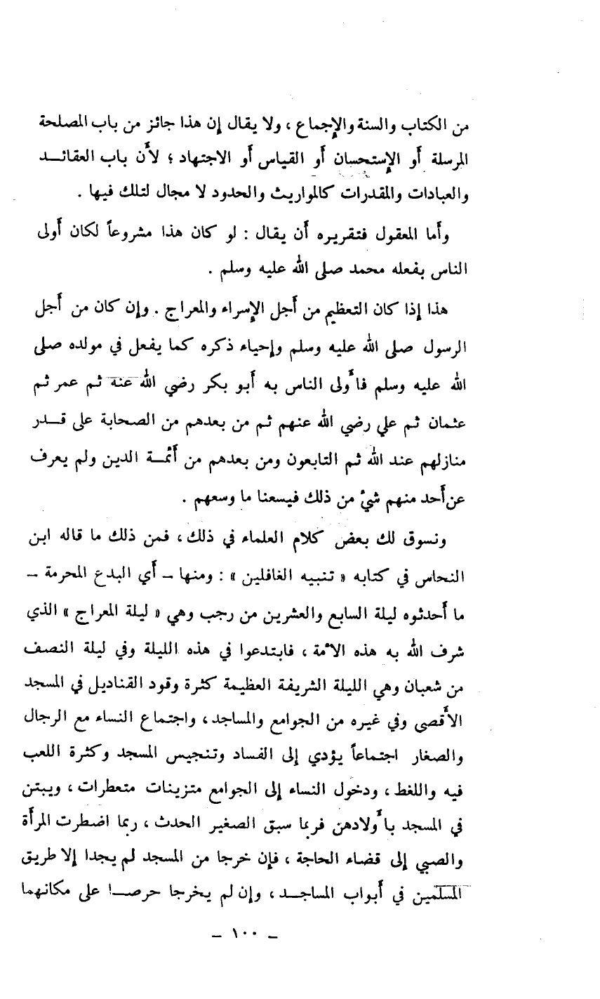ونسوق لك بعض كلام العلماء في ذلك، فمن ذلك ما قاله ابن النحاس في كتابه " تنبيه الغافلين": ومنها ـ أي البدع المحرمة ـ ما أحدثوه ليلة السابع والعشرين من رجب وهي " ليلة المعراج " الذي شرف الله به هذه الأمة، فابتدعوا في هذه الليلة وفي ليلة النصف من شعبان وهي الليلة الشريفة العظيمة كثرة وقود القناديل في المسجد الأقصى وفي غيره من الجوامع والمساجد، واجتماع النساء مع الرجال والصغار اجتماعاً يؤدي إلى الفساد وتنجيس المسجد وكثرة اللعب فيه واللغط، ودخول النساء إلى الجوامع متزينات متعطرات، ويبتن في المسجد بأولادهن فربما سبق الصغير الحدث، ربما اضطرت المرأة والصبي إلى قضاء الحاجة، فإن خرجا من المسجد لم يجدا إلا طريق المسلمين في أبواب المساجد وإن لم يخرجا حرصا على مكانهما