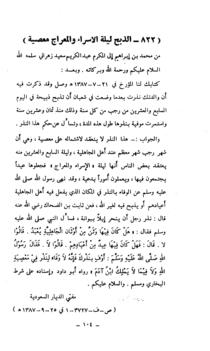 (822 ـ الذبح ليلة الاسراء والمعراج معصية)