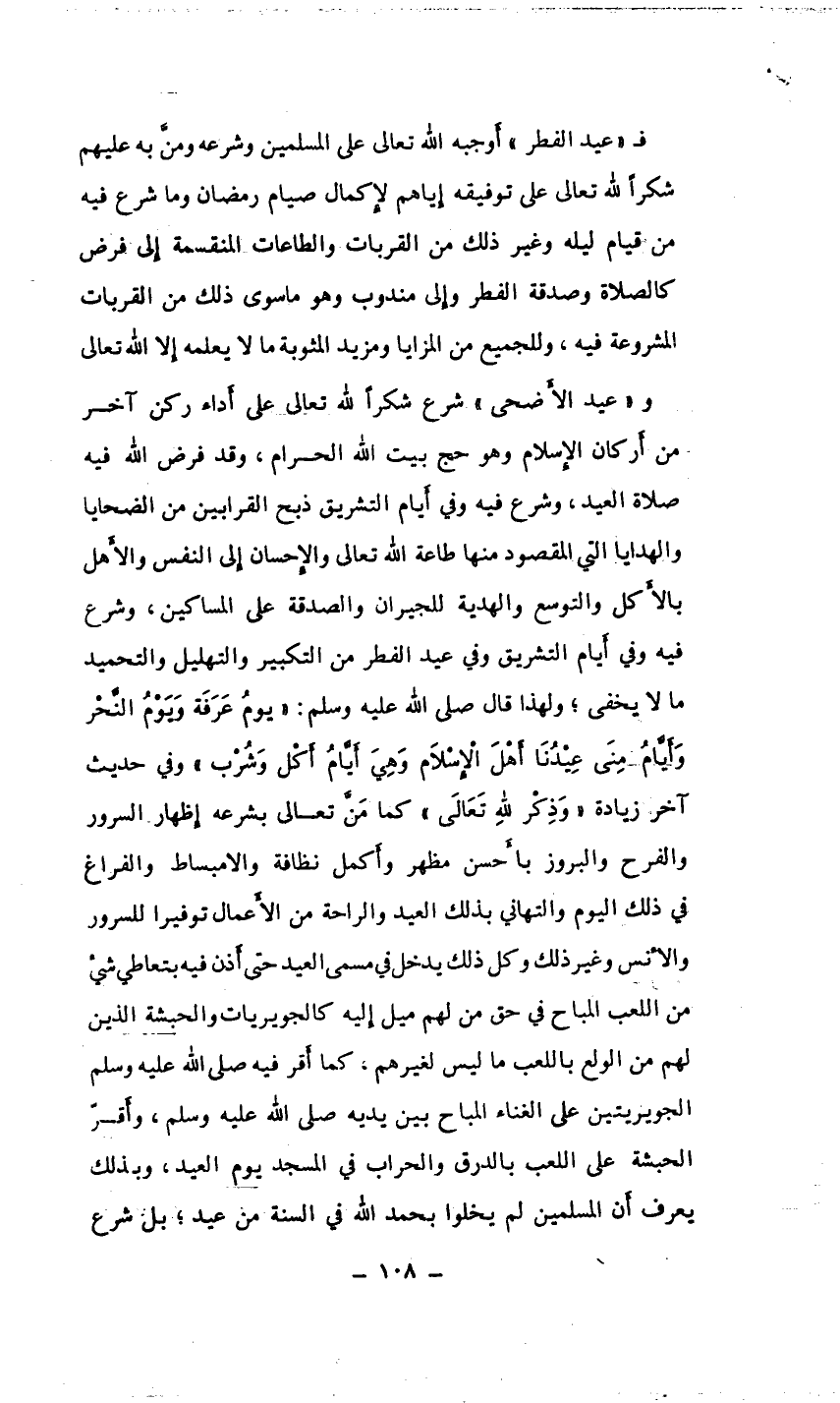 فـ" عيد الفطر" أوجبه الله تعالى على المسلمين وشرعه ومنّ به عليهم شكراً لله تعالى على توفيقه إياهم لإكمال صيام رمضان وما شرع فيه من قيام ليله وغير ذلك من القربات والطاعات المنقسمة إلى فرض كالصلاة وصدقة الفطر وإلى مندوب وهو ماسوى ذلك من القربات المشروعة فيه، وللجميع من المزايا ومزيد المثوبة ما لا يعلمه إلا الله تعالى و " عيد الأضحى " شرع شكراً لله تعالى على أداء ركن آخر من أركان الإسلام وهو حج بيت الله الحرام، وقد فرض الله فيه صلاة العيد، وشرع فيه وفي أيام التشريق ذبح القرابين من الضحايا والهدايا التي المقصود منها طاعة الله تعالى والإحسان إلى النفس والأهل بالأكل والتوسع والهدية للجيران والصدقة على المساكين، وشرع فيه وفي أيام التشريق وفي عيد الفطر من التكبير والتهليل والتحميد ما لا يخفى، ولهذا قال صلى الله عليه وسلم: " يوم عرفة ويوم النحر وأيام منى عيدنا أهل الإسلام وهي أيام أكل وشرب " وفي حديث آخر زيادة " وذكر لله تعالى " كما منّ تعالى بشرعه إظهار السرور والفرح ولابروز بأحسن مظهر وأكمل نظافة والامبساط والفراغ في ذلك اليوم والتهاني بذلك العيد والراحة من الأعمال توفيراً للسرور والأنس وغير ذلك وكل ذلك يدخل في مسمى العيد حتى أذن فيه بتعاطي شيء من اللعب المباح في حق من لهم ميل إليه كالجويريات والحبشة الذين لهم من الولع باللعب ما ليس لغيرهم , كما أقر فيه صلى الله عليه وسلم الجويريتين على الغناء المباح بين يديه صلى الله عليه وسلم: وأقر الحبشة على اللعب بالدرق والحراب في المسجد يوم العيد، وبذلك يعرف أن المسلمين لم يخلوا بحمد الله في السنة من عيد، بل شرع