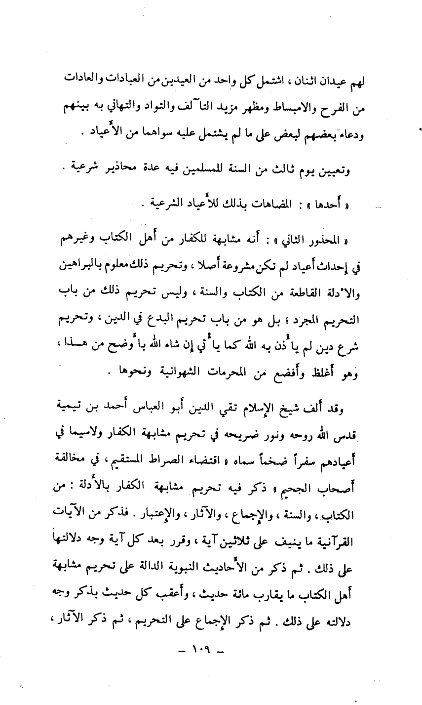 وقد ألف شيخ الإسلام تقي الدين أبو العباس أحمد بن تيمية قدس الله روحه ونور ضريحه في تحريم مشابهة الكفار ولا سيما في أعيادهم سفراً ضخماً سماه " اقتضاء الصراط المستقيم، في مخالفة أصحاب الجحيم " ذكر فيه تحريم مشابهة الكفار بالأدلة: من الكتاب، والسنة، والإجماع، والآثار، والإعتبار، فذكر من الآيات القرآنية ما ينيف على ثلاثين آية، وقرر بعد كل آية وجه دلالتها على ذلك , ثم ذكر من الأحاديث النبوية الدالة على تحريم مشابهة أهل الكتاب ما يقارب مائة حديث، وأعقب كل حديث بذكر وجه دلالته على ذلك، ثم ذكر الإجماع على التحريم، ثم ذكر الآثار.