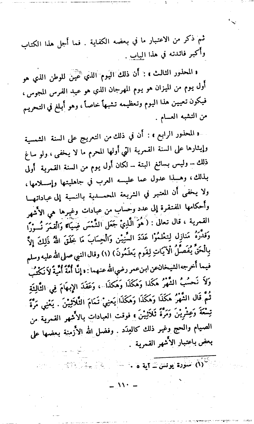 " المحذور الرابع ": ان في ذاك من التعريج على السنة الشمسية وإيثارها على السنة القسرية التي أولها المحرم ما لا يخفى، ولو ساغ ذلك ـ وليس بسائغ البتة ـ لكان أول يوم من السنة القمرية أولى بذلك، وهذا عدول عما عليه العرب في جاهليتها وإسلامها، ولا يخفى أن المعتبر في الشريعة المحمدية بالنسبة إلى عباداتها وأحكامها الفتقرة إلى عدد وحساب من عبادات وغيرها هي الأشهر القمرية، قال تعالى {هو الذي جعل الشمس ضياء والقمر نوراً وقدره منازل لتعلموا عدد السنين والحساب ما خلق الله ذلك إلا بالحق يفصل الآيات لقوم يعلمون} (¬1) وقال النبي صلى الله عليه وسلم فيما أخرجه الشيخان عن ابن عمر رضي الله عنهما: " إنا أمة أمية لا نكتب ولا نحسب الشهر هكذا وهكذا وهكذا، وعقد الإبهام في الثالثة ثم قال: الشهر هكذا وهكذا وهكذا يعني تمام الثلاثين يعني مرة تسعة وعشرين ومرة ثلاثين " فوقت العبادات بالأشهر القمرية من الصيام والحج وغير ذلك كالعدد، وفضل الله الأزمنة بعضها على بعض باعتبار الأشهر القمرية.