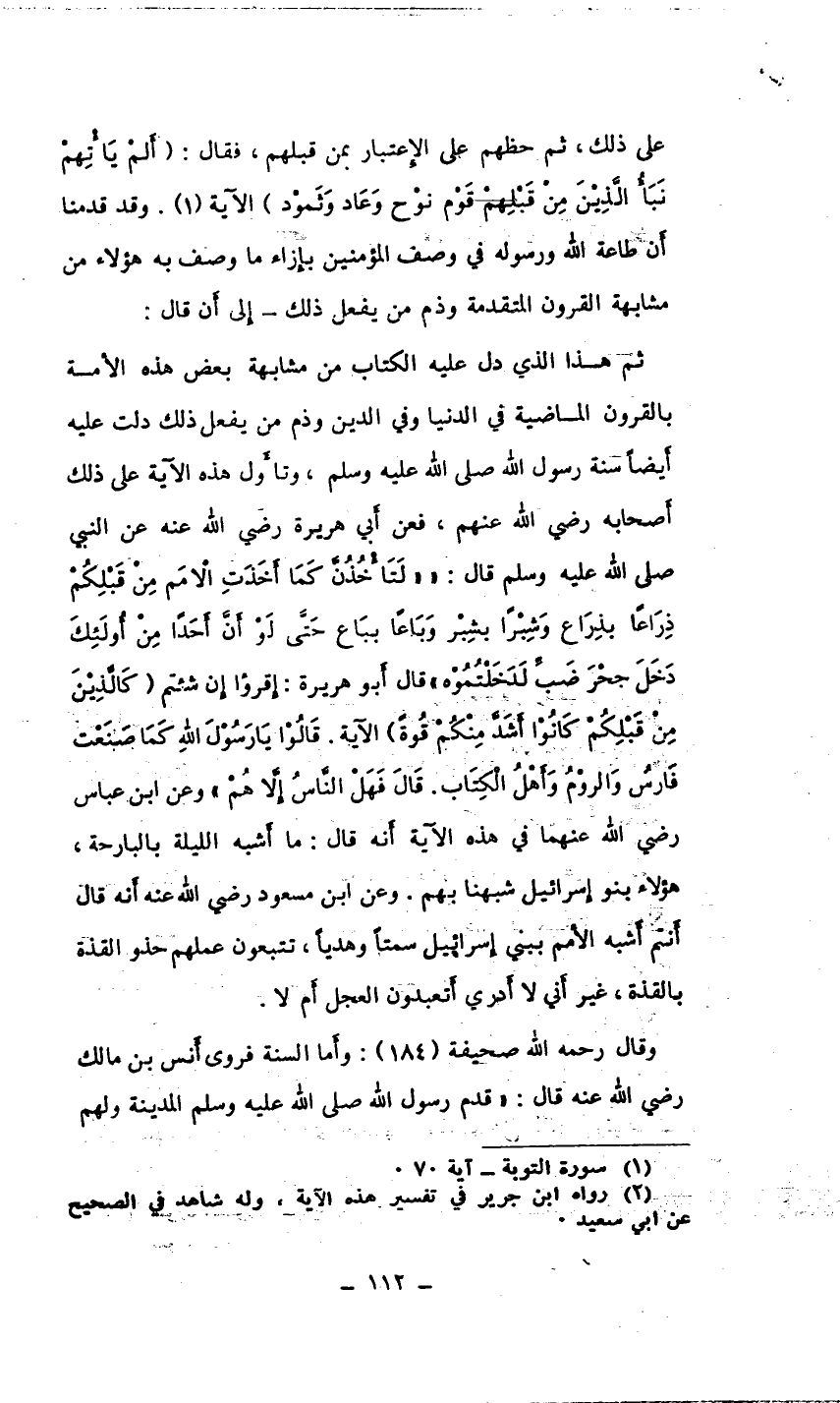 ثم هذا الذي دل عليه الكتاب من مشابهة بعض هذه الأمة بالقرون الماضية في الدنيا وفي الدين وذم من يفعل ذلك دلت عليه أيضاً سنة رسول الله صلى الله عليه وسلم، وتأول هذه الآية على ذلك أصحابه رضي الله عنهم، فعن أبي هريرة رضي الله عنه عن النبي صلى الله عليه وسلم قال: " لتأخذن كما أخذت الأمم من قبلكم ذراعاً بذراع وشبراً بشبر وباعاً بباع حتى لو أن أحداً من أولئك دخل جحر ضب لدخلتموه " (¬2) قال أبو هريرة: إقرؤوا إن شئتم {كالذين من قبلكم كانوا أشد منكم قوة} الآية قالوا: يارسول الله كما صنعت فارس والروم وأهل الكتاب، قال: فهل الناس إلا هم " وعن ابن عباس رضي الله عنهما في هذه الآية أنه قال: ما أشبه الليلة بالبارحة، هؤلاء بنوا إسرائيل شبهنا بهم، وعن ابن مسعود رضي الله عنه أنه قال: أنتم أشبه الأمم ببني إسرائيل سمتاً وهدياً، تتبعون عملهم حذو القذة بالقذة، غير أني لا أدري أتعبدون العجل أم لا.