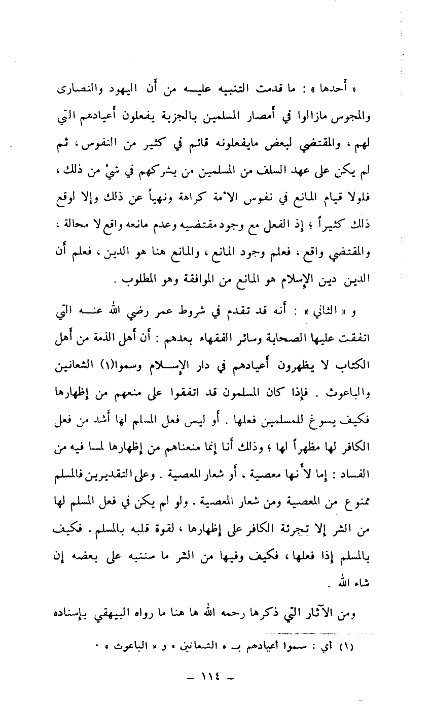 " أحدها ": ما قدمت التنبيه عليه من أن اليهود والنصارى والمجوس ما زالوا في أمصار المسلمين بالجزية يفعلون أعيادهم التي لهم، والمقتضى لبعض ما يفعلونه قائم في كثير من النفوس، ثم لم يكن على عهد السلف من المسلمين من يشركهم في شيء من ذلك، فلولا قيام المانع في نفوس الأمة كراهة ونهياً عن ذلك وإلا لوقع ذلك كثيراً، إذ الفعل مع وجود مقتضيه وعدم مانعه واقع لا محالة، والمقتضي واقع، فعلم وجود المانع، والمانع هنا هو الدين، فعلم أن الدين دين الإسلام هو المانع من الموافقة وهو المطلوب.