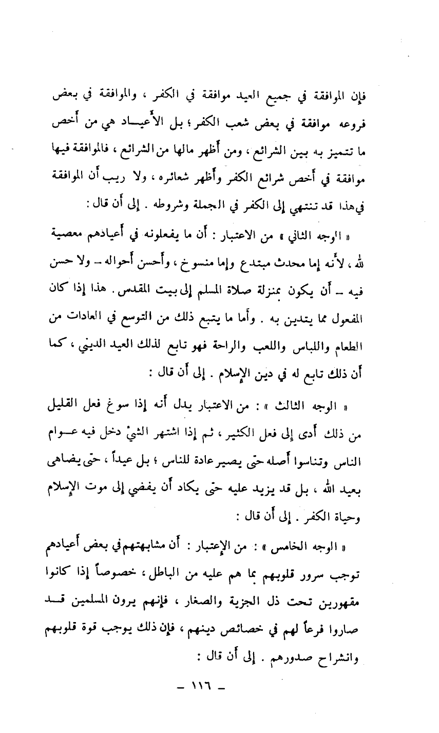 " الوجه الخامس" من الإعتبار: أن مشابهتهم في بعض أعيادهم توجب سرور قلوبهم بما هم عليه من الباطل، خصوصاً إذا كانوا مقهورين تحت ذل الجزية والصغار، فإنهم يرون المسلمين قد صاروا فرعاً لهم في خصائص دينهم، فإن ذلك يوجب قوة قلوبهم وانشراح صدورهم إلى أن قال: